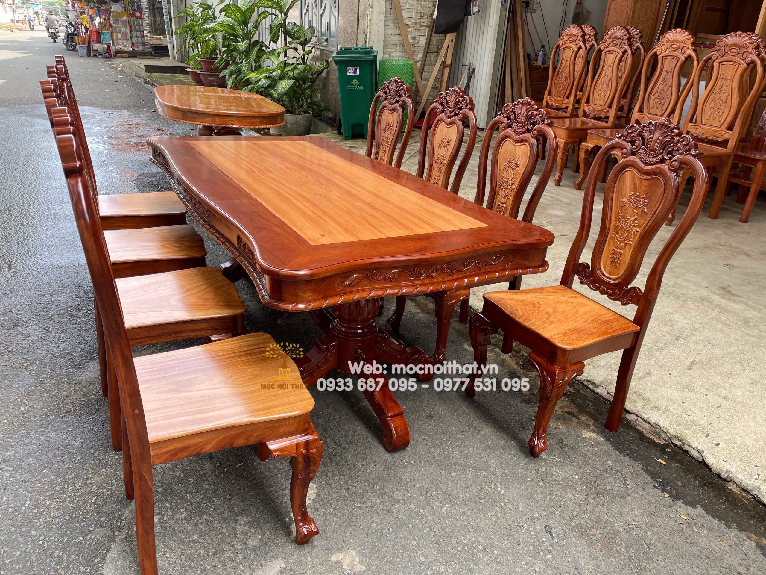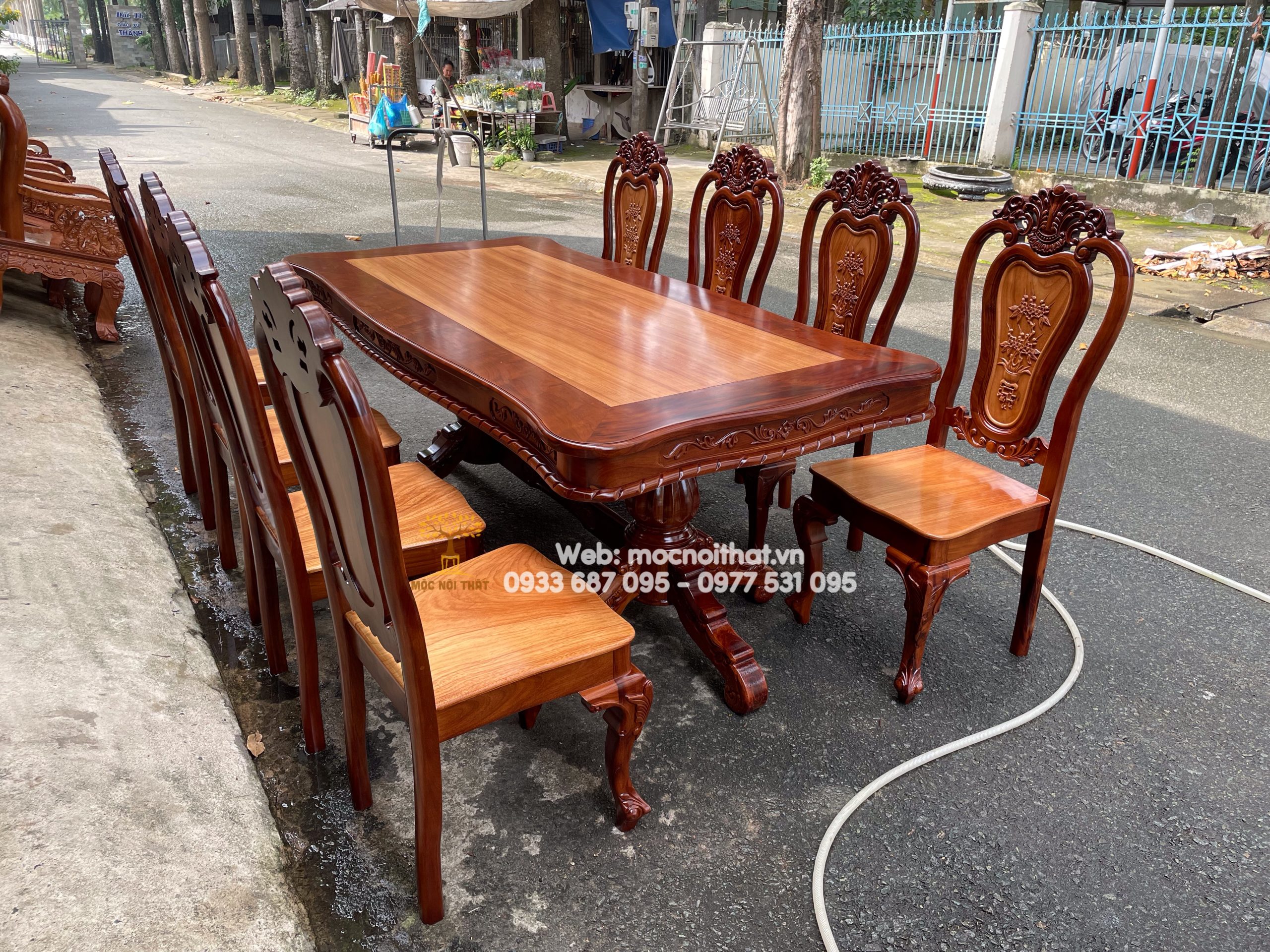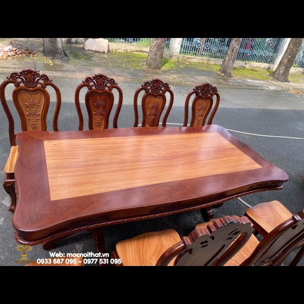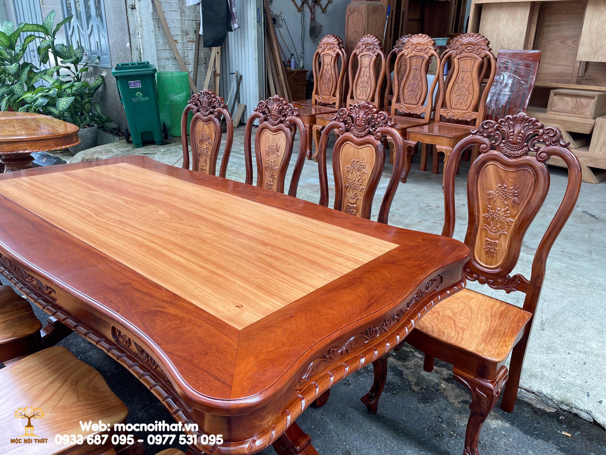 • Bộ bàn ăn được làm từ gỗ Căm Xe , mặt bằng Gỗ Gõ Đỏ kiểu bánh tây mặt trơn, kèm 8 ghế bàn ăn làm tựa lớn và chạm hoa văn sắc nét.