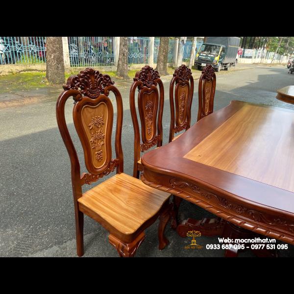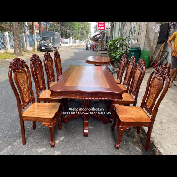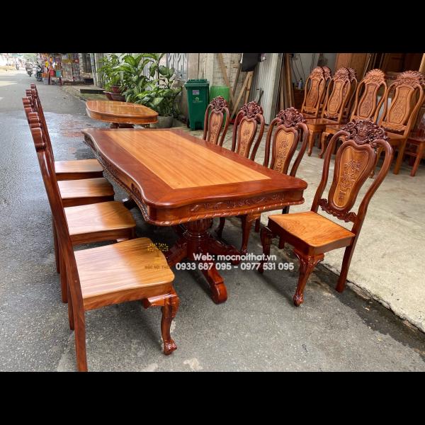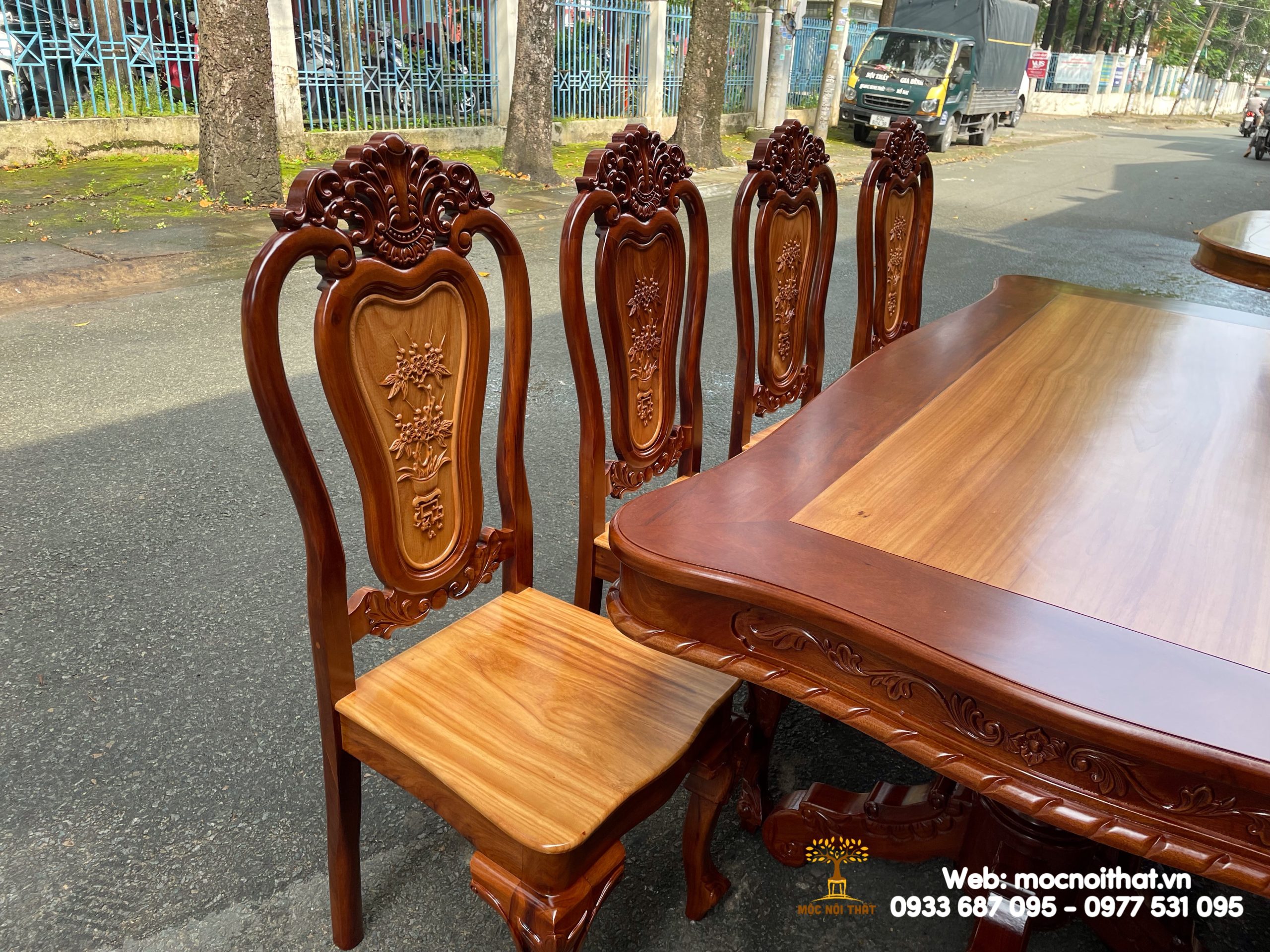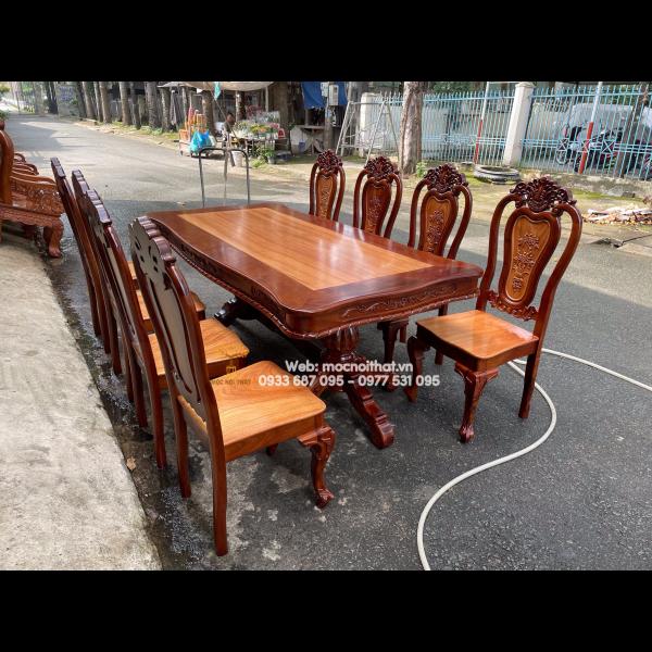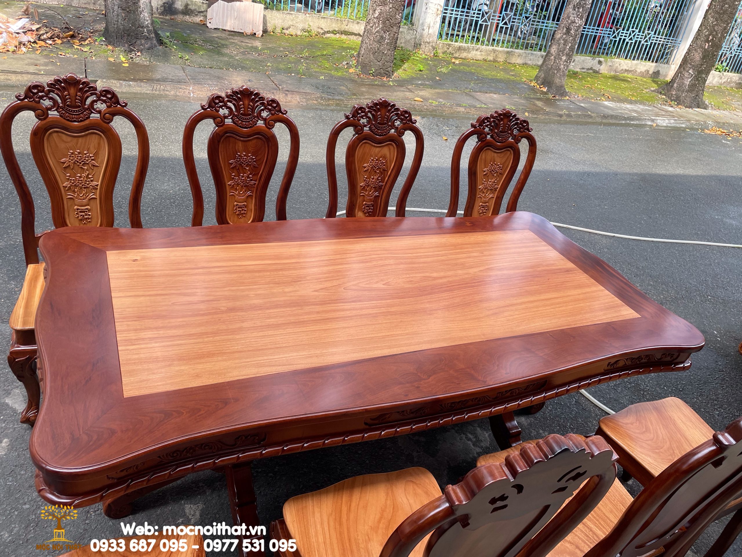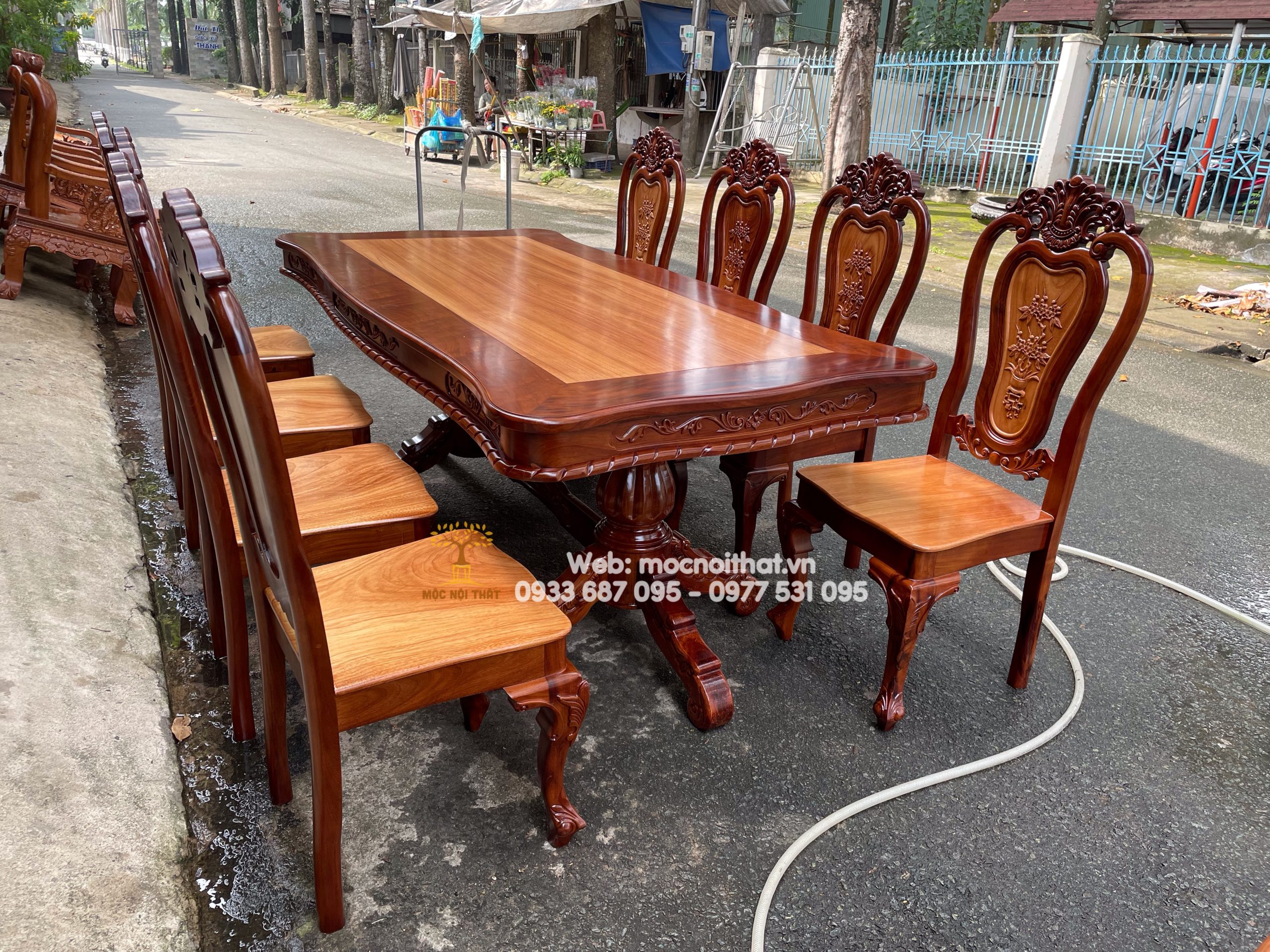 • Bộ bàn ăn được làm từ gỗ Căm Xe , mặt bằng Gỗ Gõ Đỏ kiểu bánh tây mặt trơn, kèm 8 ghế bàn ăn làm tựa lớn và chạm hoa văn sắc nét.