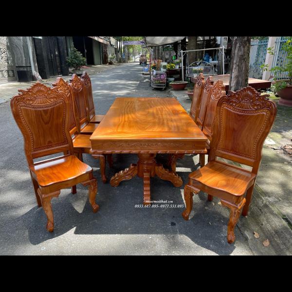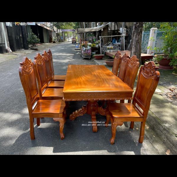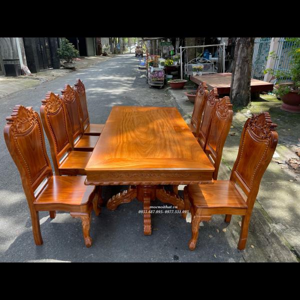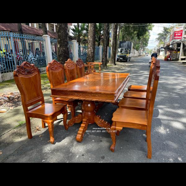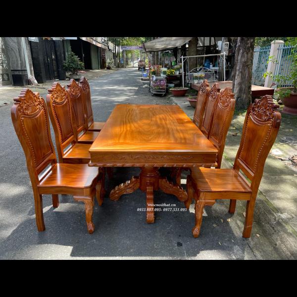 • Bàn ăn được làm hoàn toàn bằng gỗ Gõ Đỏ, xương đỡ gỗ Gõ Đỏ, mặt bàn dày 1,3cm kẹp viền bao lam ngoài dày 3cm, thiết kế nhiều kiểu dáng tùy chọn . Ghế kèm thiết kế kiểu dáng bắt mắt, tựa chạm đẹp, tựa liền dày và chắc chắn.
