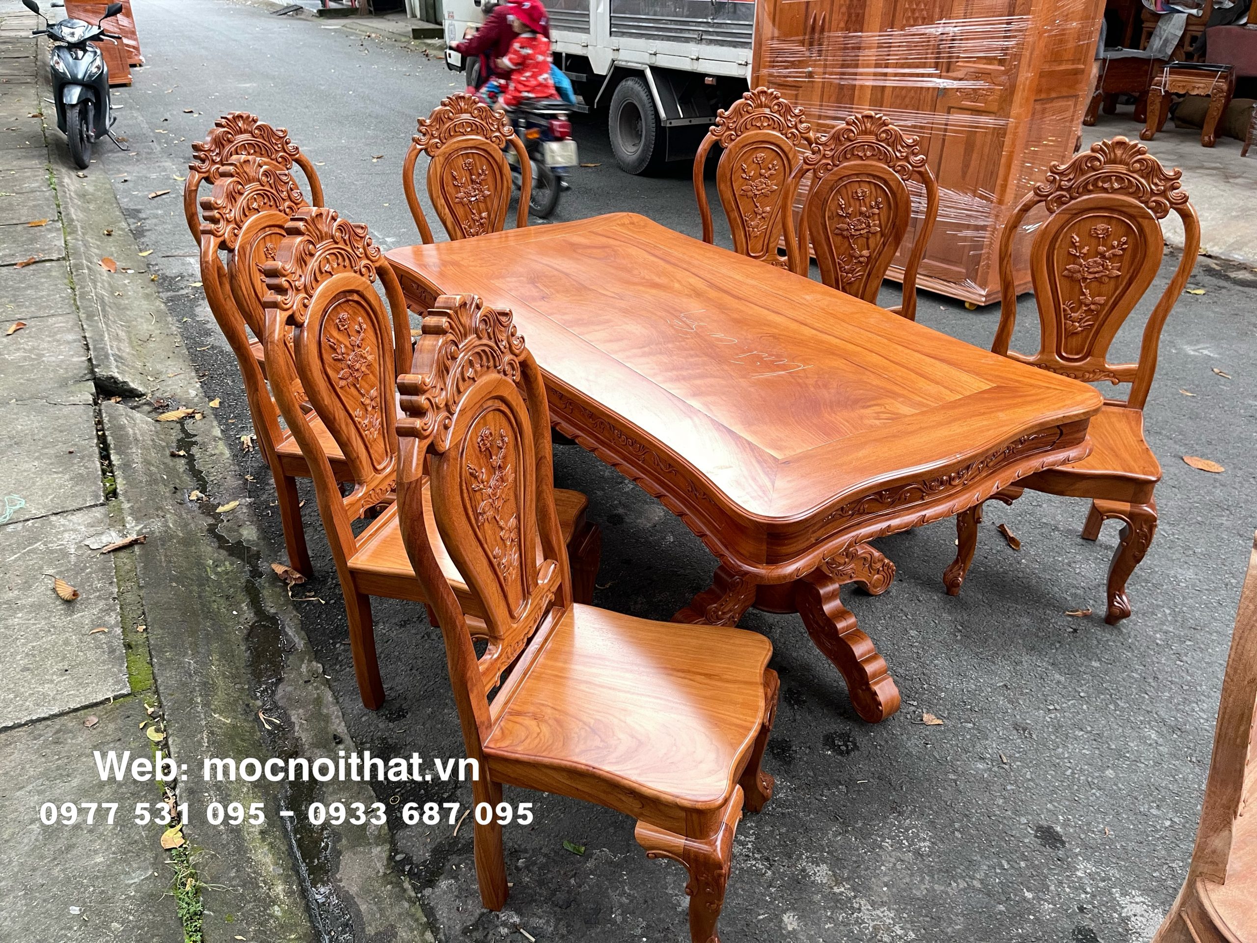 Bàn Ăn Gỗ Gõ Đỏ Kèm 8 Ghế Lá Tây Chạm Hoa Hồng Tựa Dày