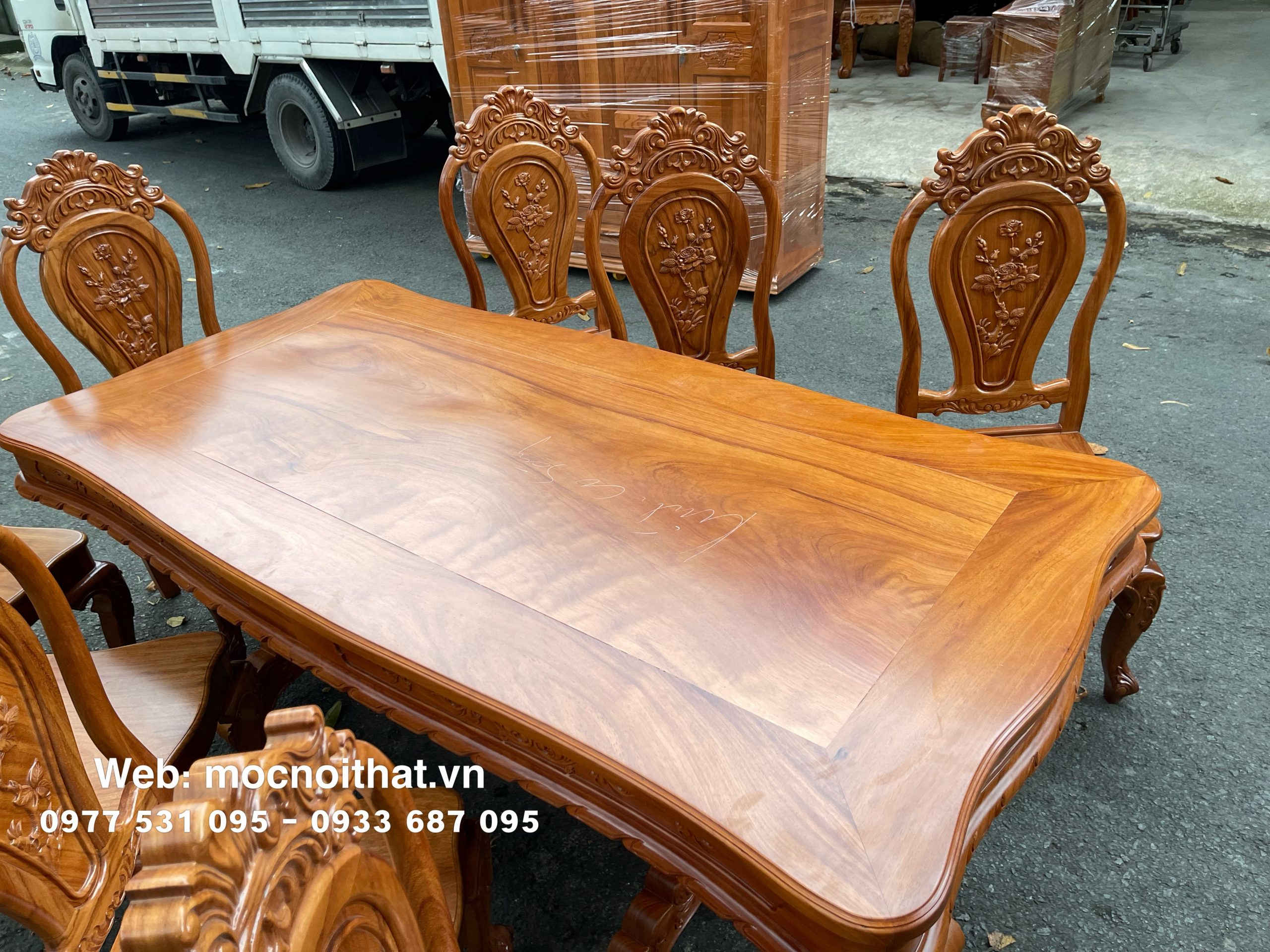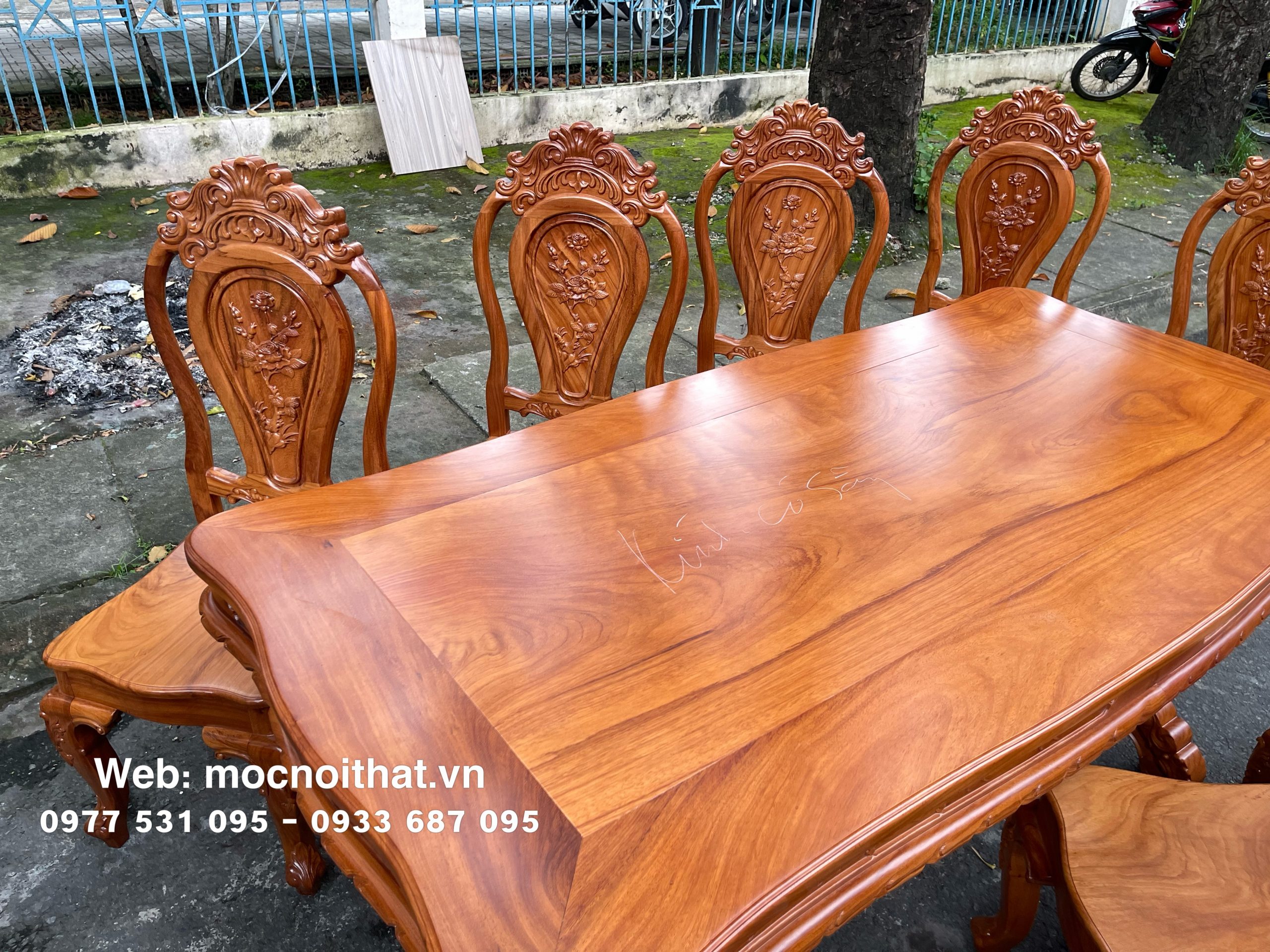 • Bàn ăn được làm hoàn toàn bằng gỗ Gõ Đỏ, xương đỡ gỗ Gõ Đỏ, mặt bàn dày 1,3cm kẹp viền bao lam ngoài dày 3cm, thiết kế nhiều kiểu dáng tùy chọn . Ghế kèm thiết kế kiểu dáng bắt mắt, tựa chạm đẹp, dày và chắc chắn.