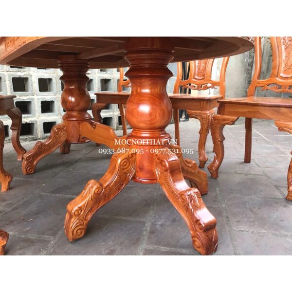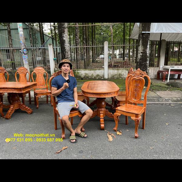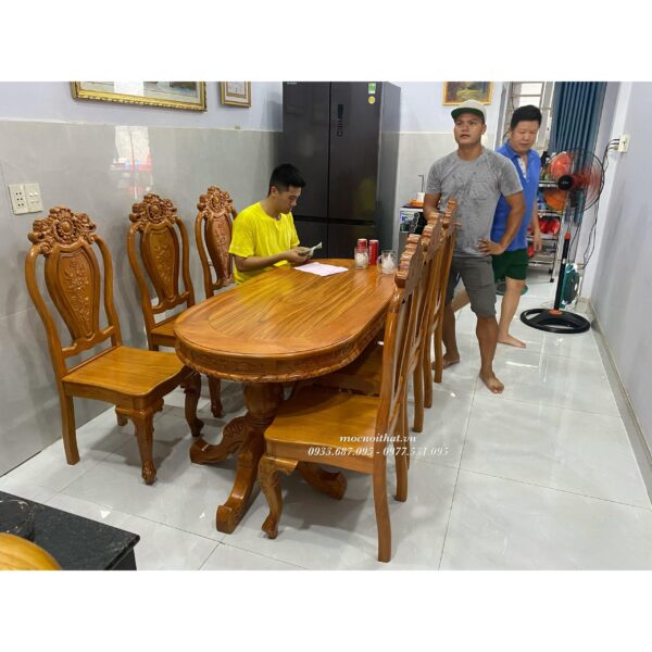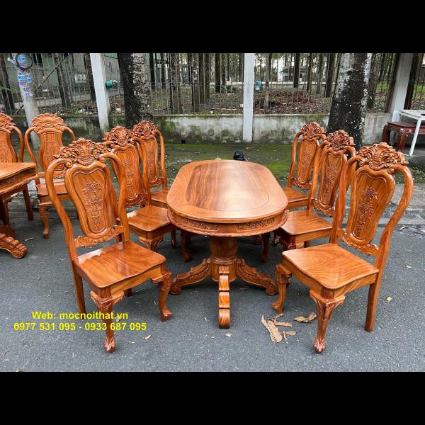 • Bàn ăn được làm bằng gỗ Gõ Đỏ, xương đỡ bàn ăn làm bằng gỗ Thao Lao, mặt bàn dày 1,3cm kẹp viền bao lam ngoài dày 2,7cm, thiết kế nhiều kiểu dáng oval, chữ nhật hoặc bánh tây tùy chọn . Ghế kèm thiết kế kiểu 2 tựa chắc chắn và dày dặn.