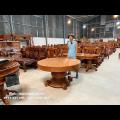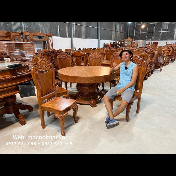 • Bộ bàn ăn tròn nguyên khối 8 ghế tựa liền dày làm bằng gỗ Gõ Đỏ 100% zin một mặt.