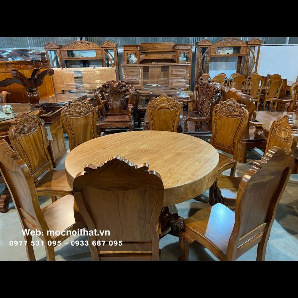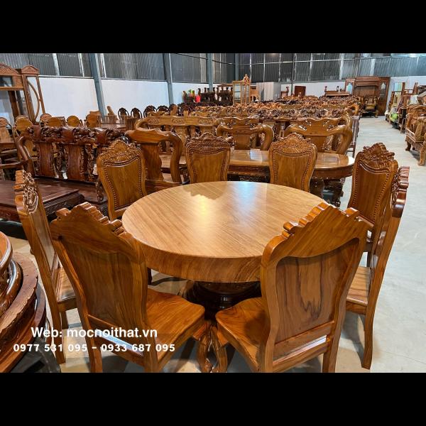 Bàn Ăn Gỗ Gõ Đỏ Tròn Nguyên Khối 8 Ghế Tựa Liền Dày