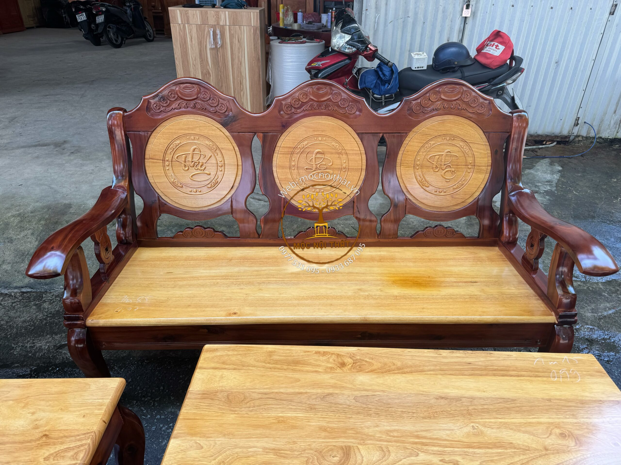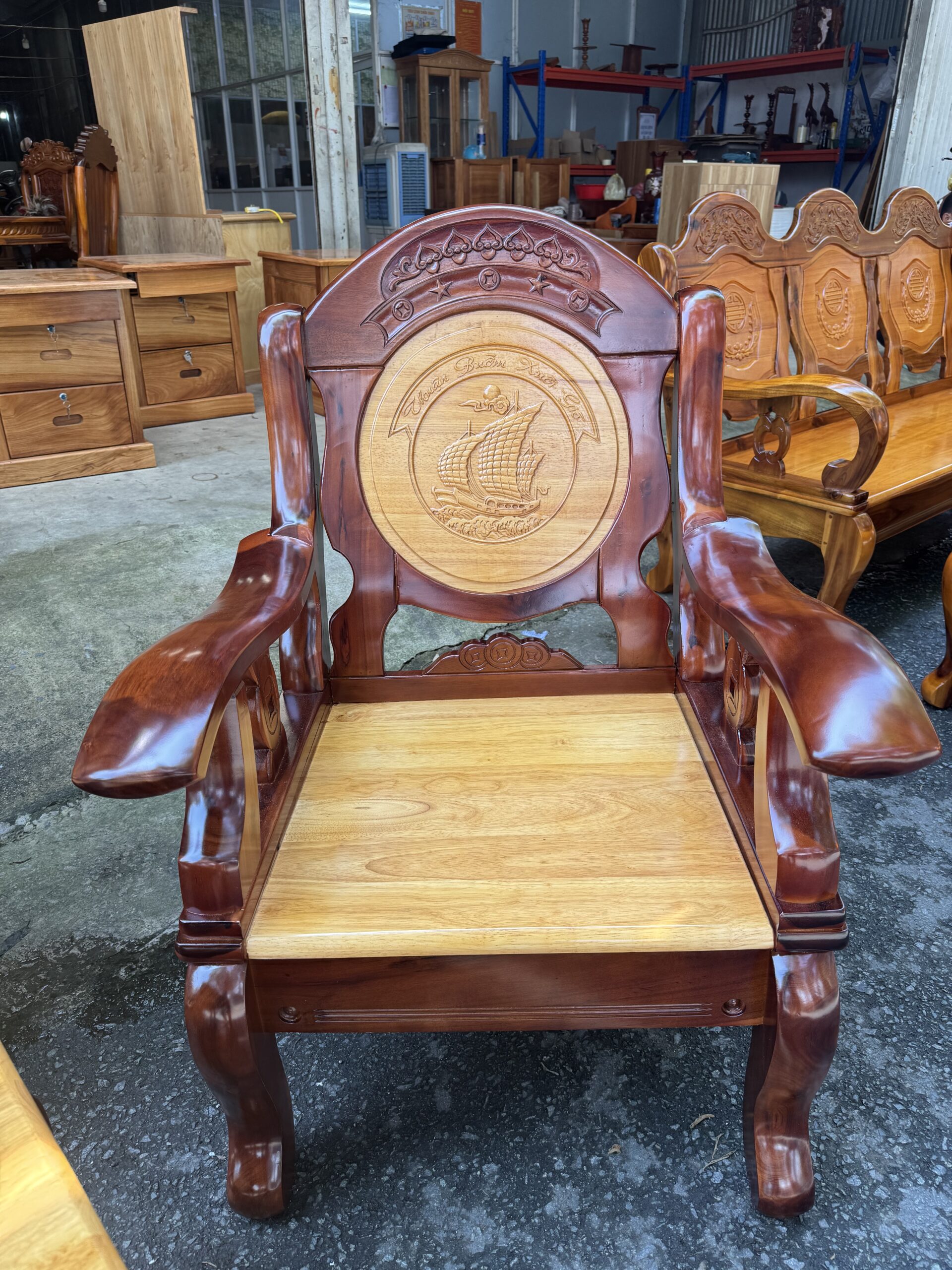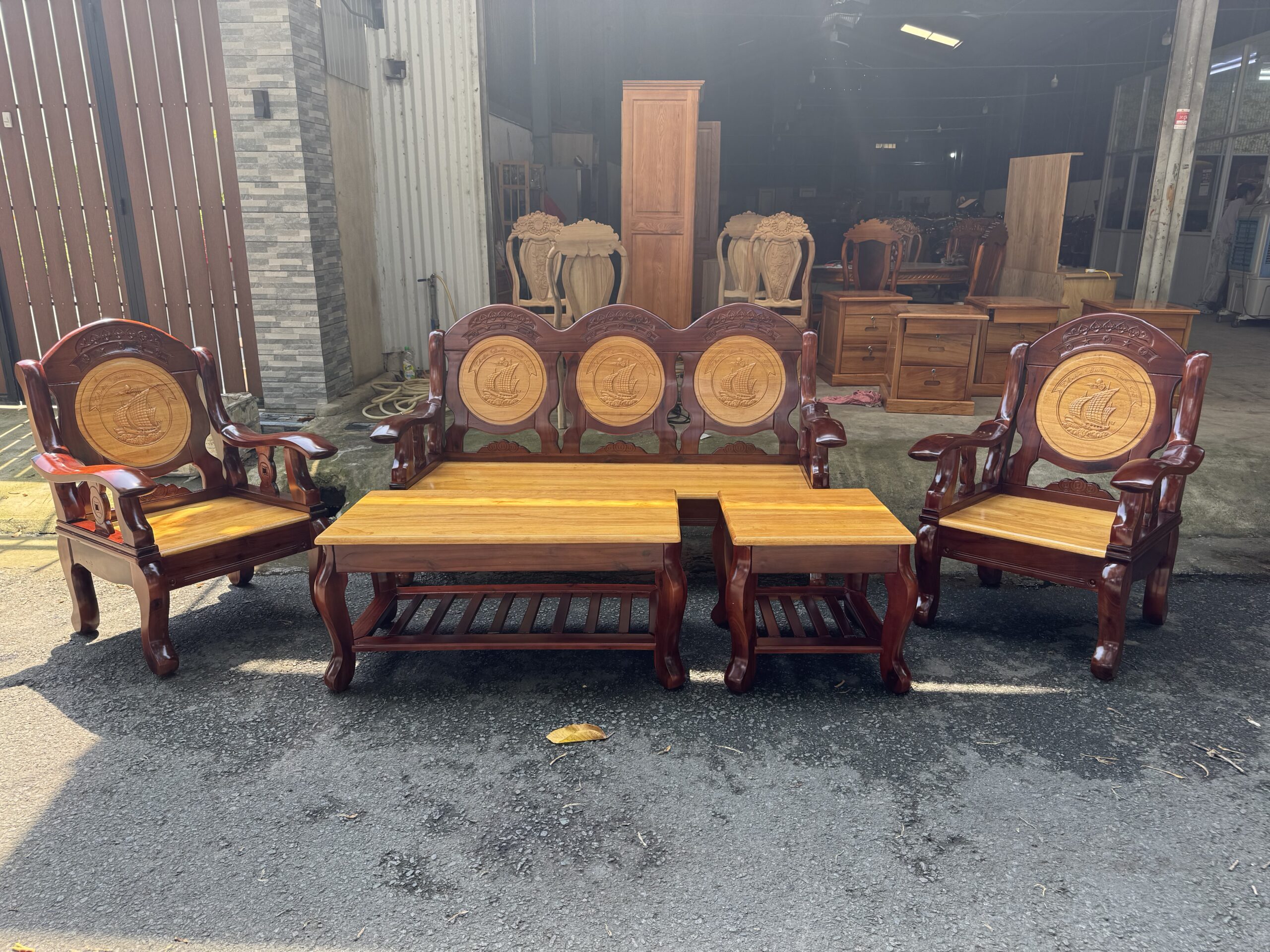 - Mô tả: Salon Jinbell được làm bằng gỗ Tràm Bông Vàng, mặt bàn mặt ghế làm từ gỗ Rubber, kiểu tựa lưng ngả ra sau nên ngồi rất thoải mái, trên tựa được chạm thuận buồm xuôi gió hoặc chạm Phúc- Lộc- Thọ tùy ý khách chọn. Mặt tràn nguyên dày 2cm.