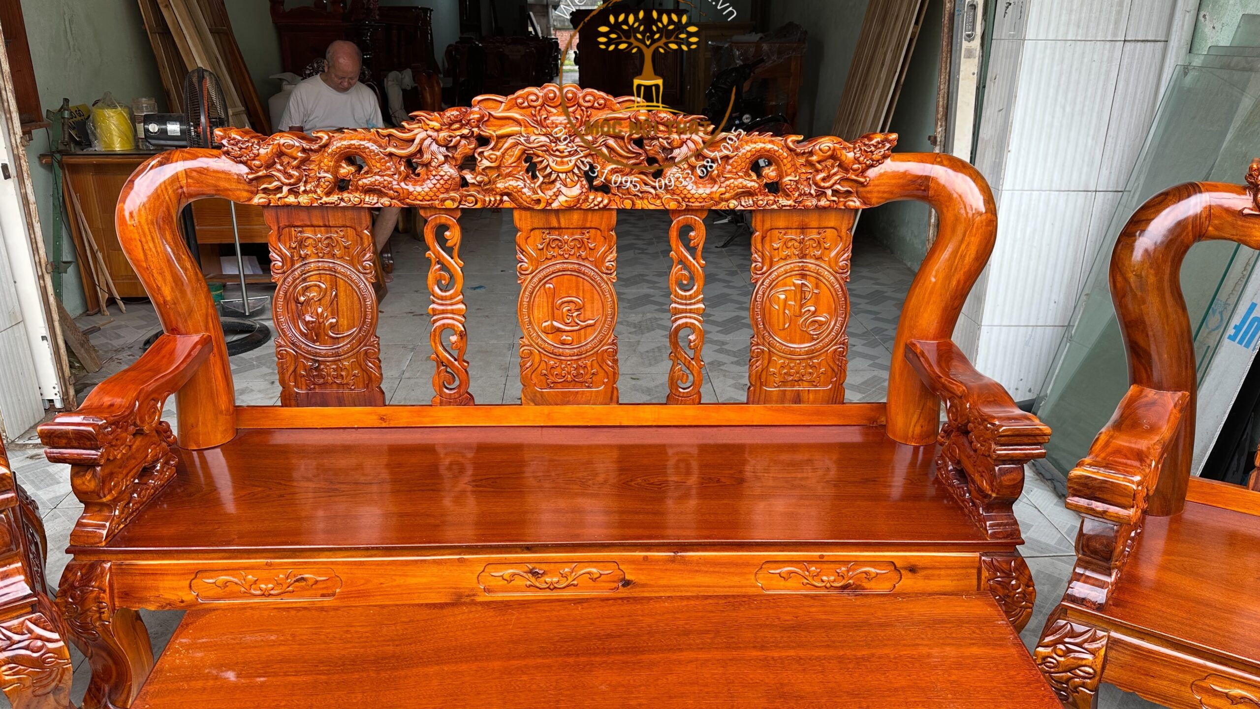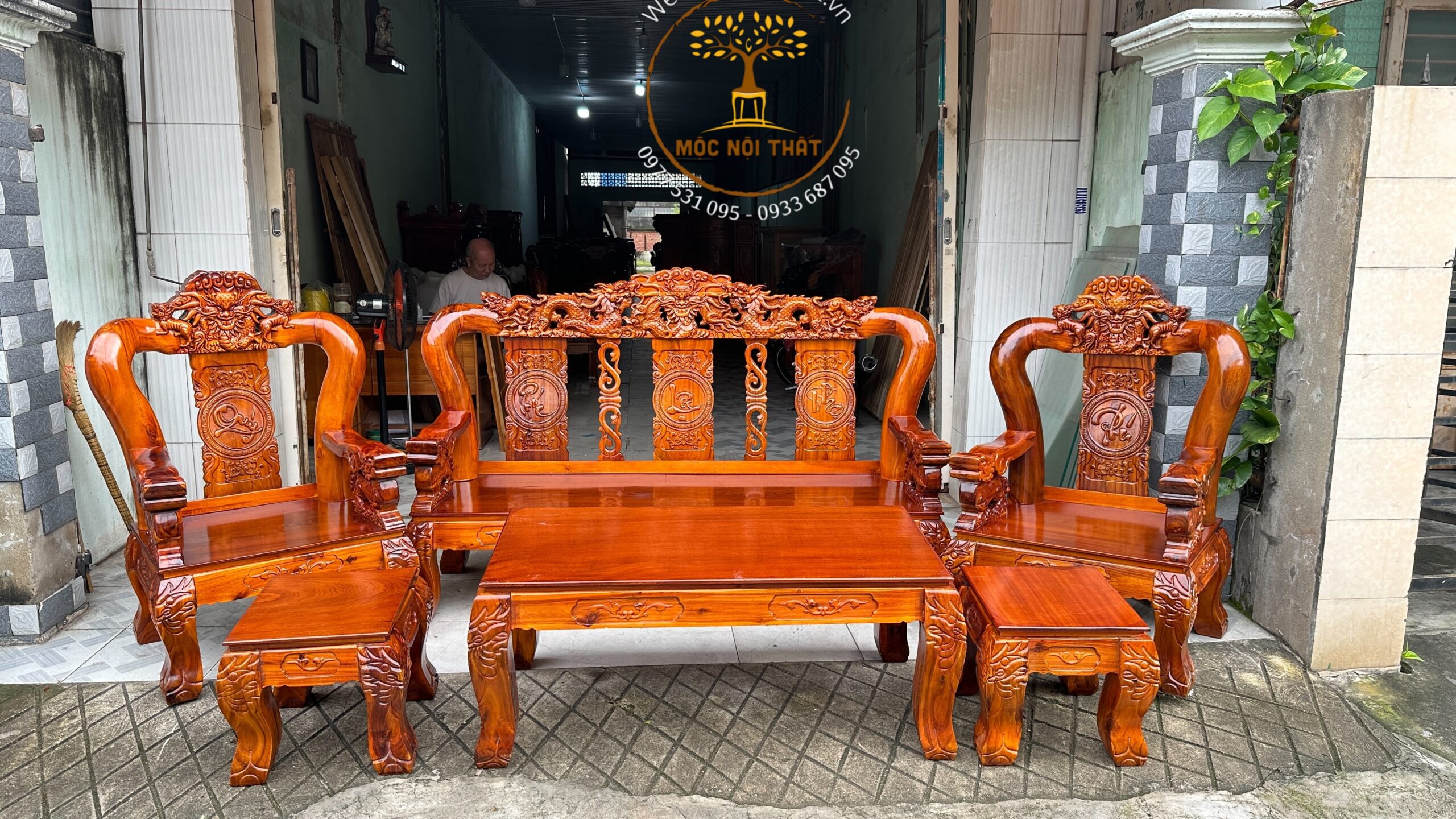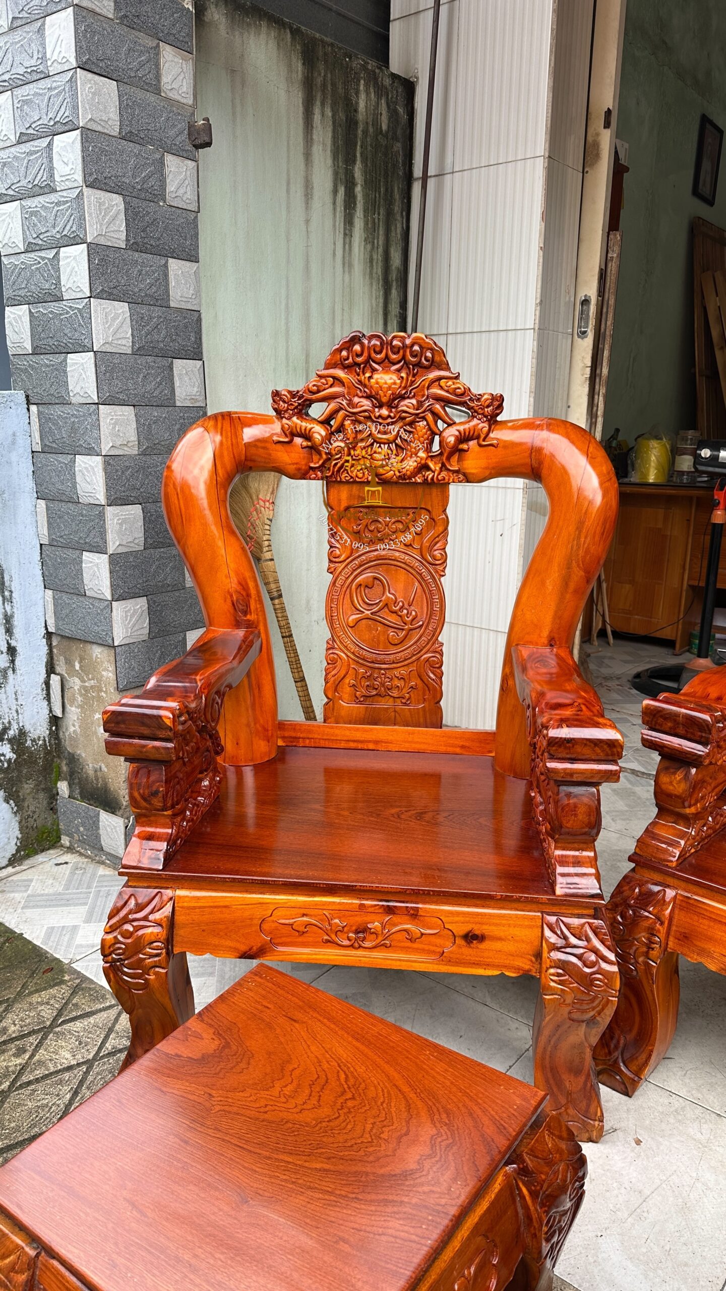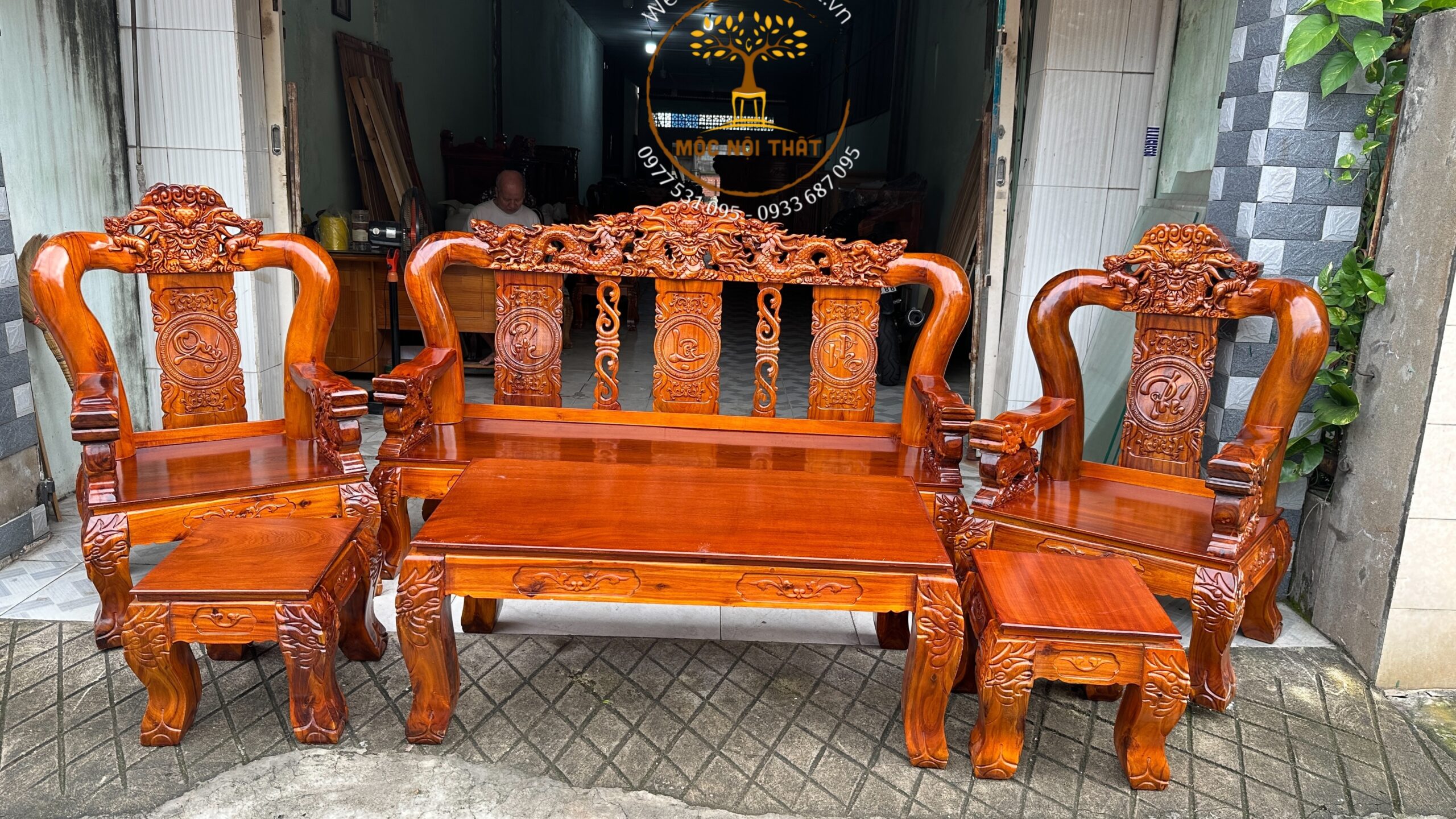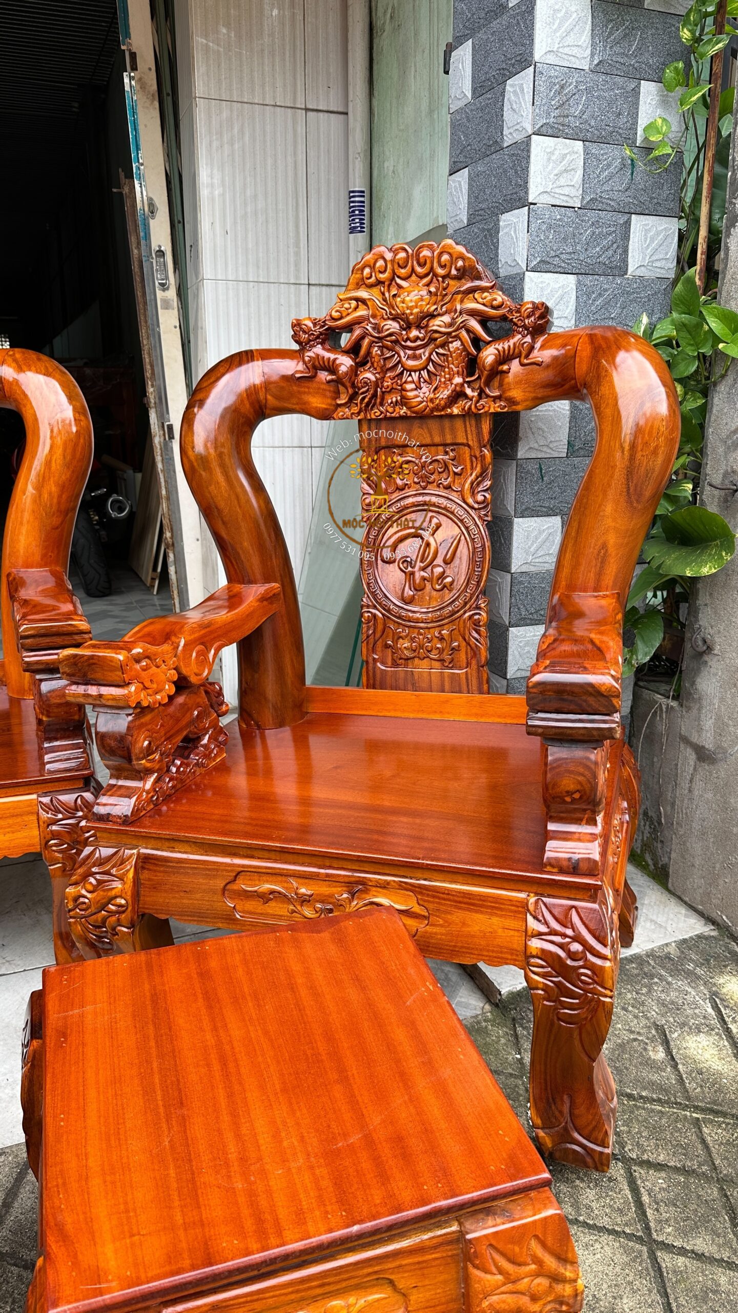 Ghế salon Triện làm từ gỗ Tràm Bông Vàng mặt gỗ Hồng Đào, đỉnh ghế chạm Rồng Cao Hổ Phù, tựa ghế dáng tròn chạm cnc Phúc- Lộc- Thọ, Phú Quý. Tay ghế 12cm, dưới tay chạm rồng hoặc lân nguyên con.