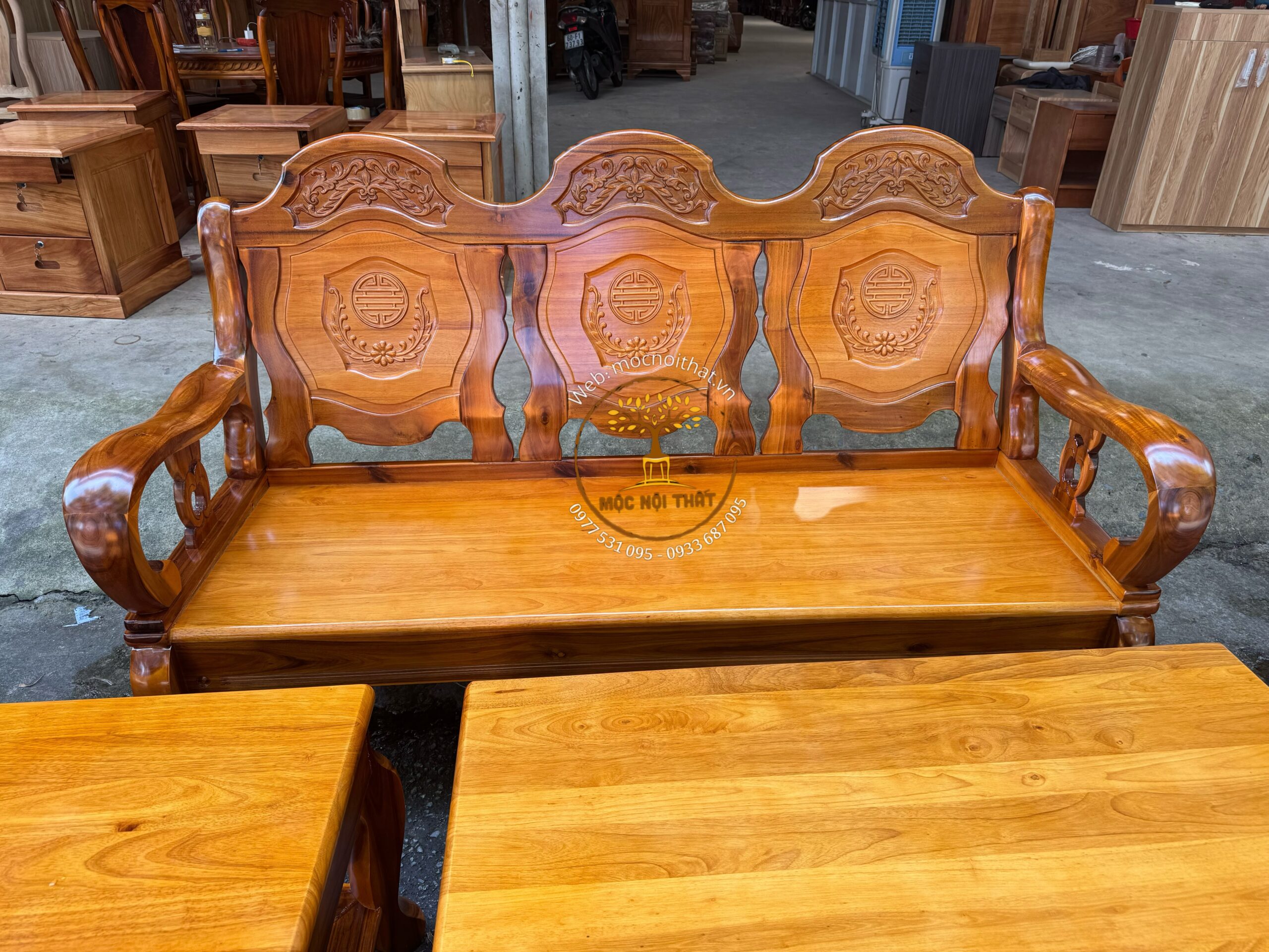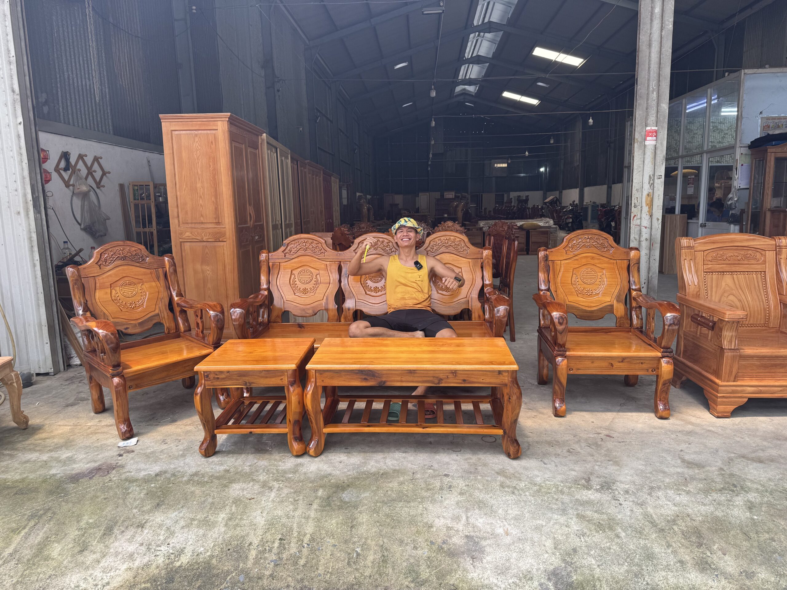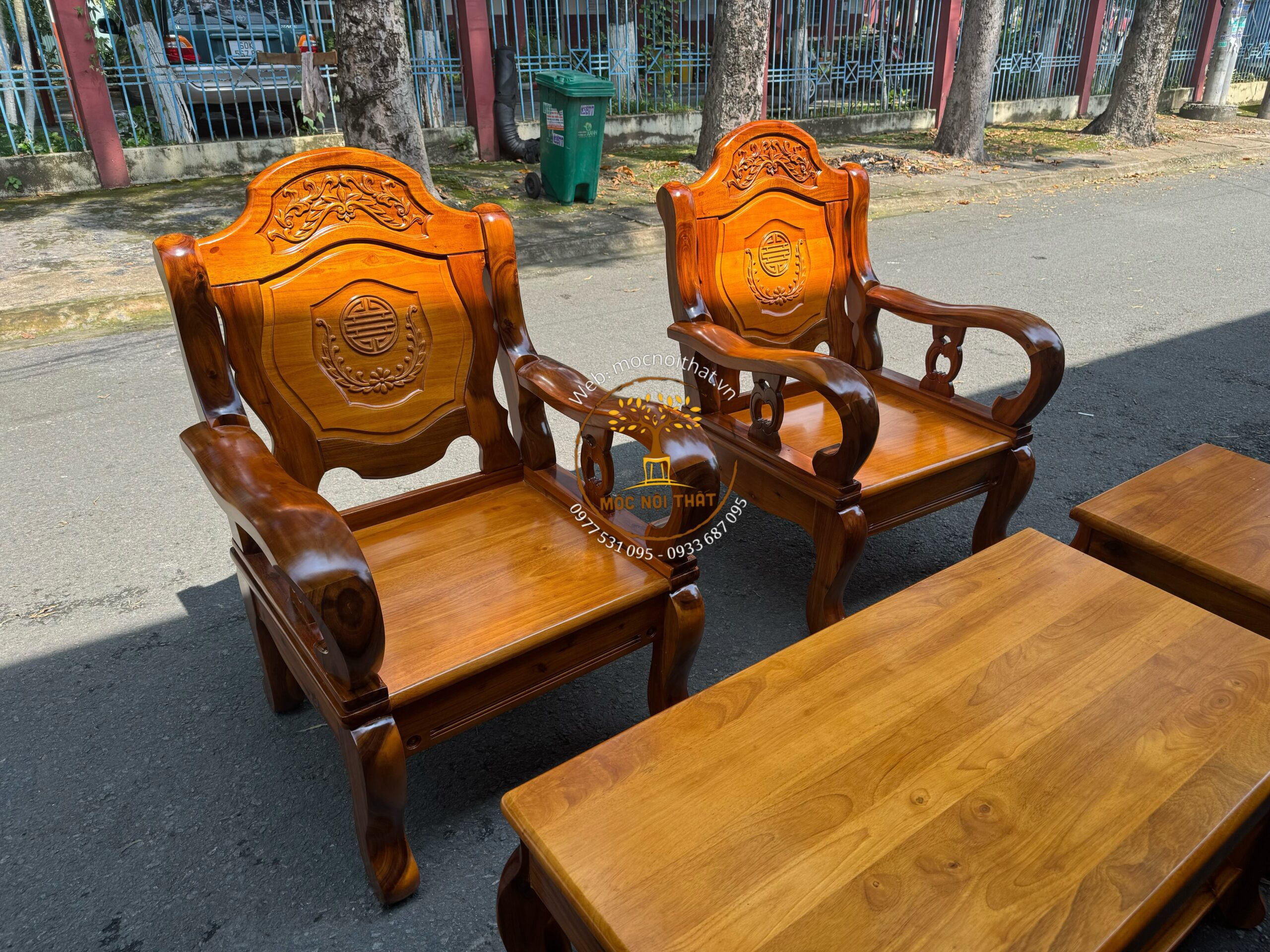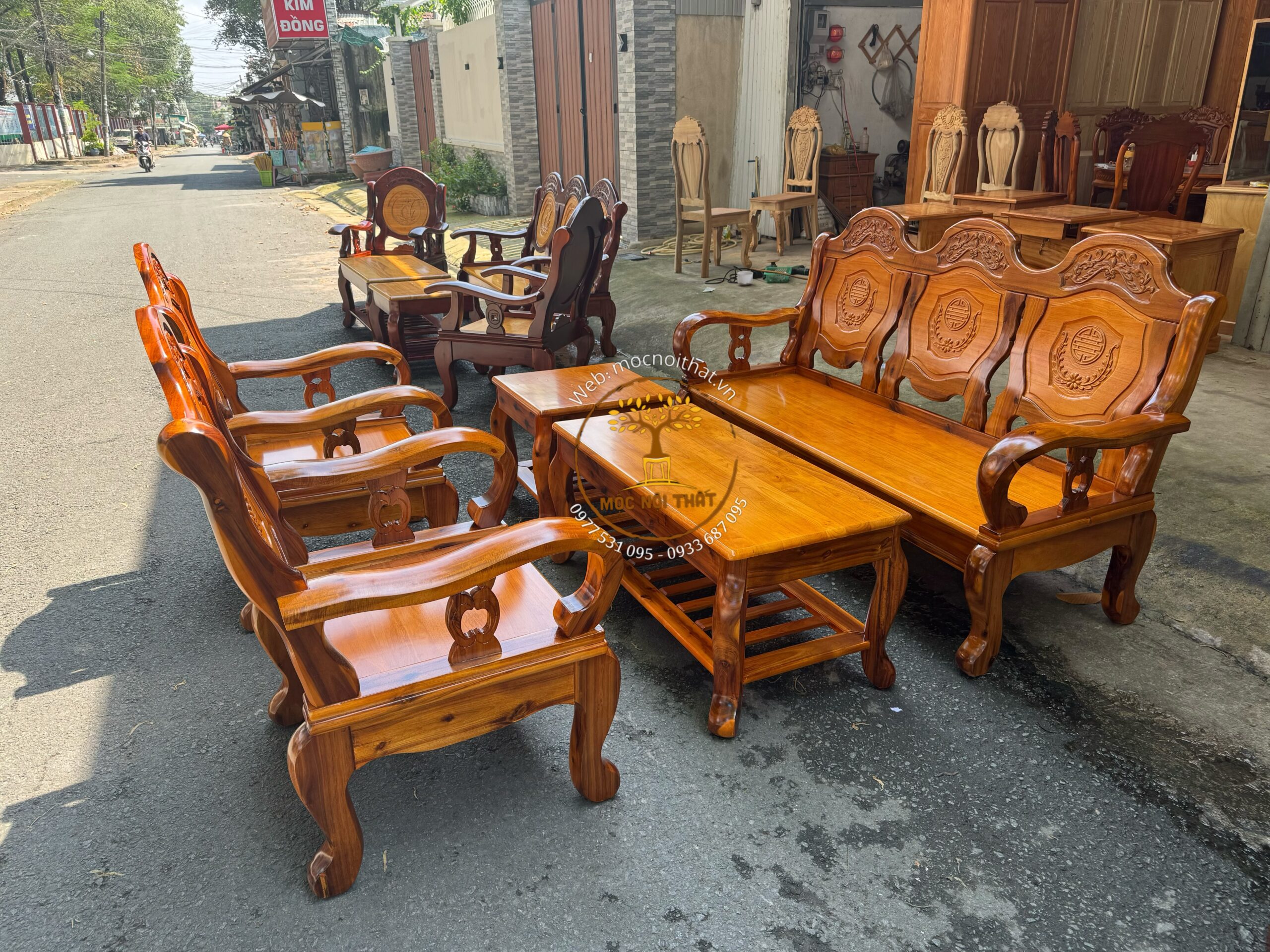 • Mô tả: Salon Stone được làm bằng gỗ Tràm Bông Vàng, mặt bàn mặt ghế làm từ gỗ Rubber, kiểu tựa lưng ngả ra sau nên ngồi rất thoải mái, trên tựa được chạm chữ Thọ bằng chữ Tàu. Mặt tràn nguyên dày 2cm.