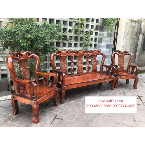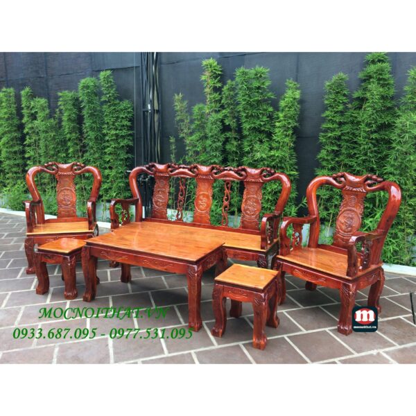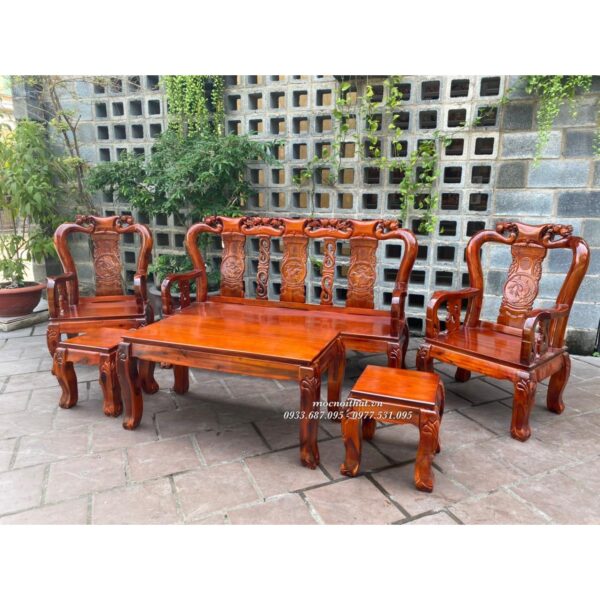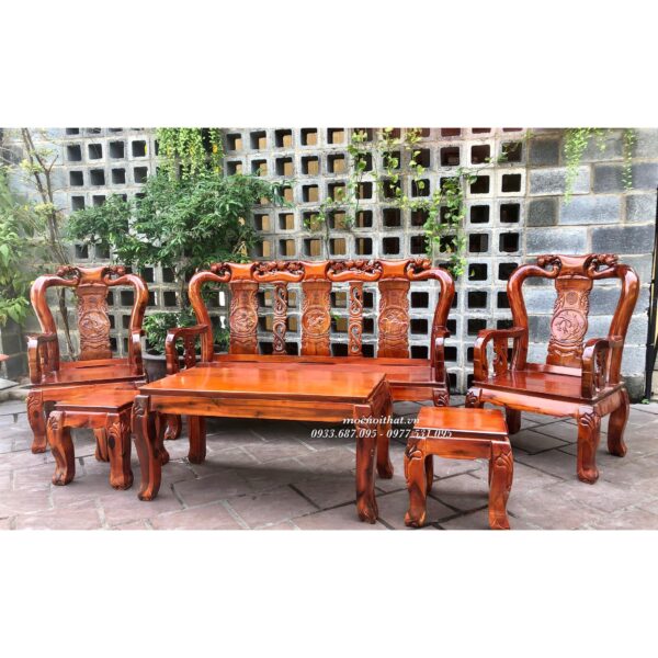 • Mô tả: Salon được làm bằng gỗ Tràm Bông Vàng, thiết kế nhỏ gọn, tựa ghế được làm tròn và tựa chạm tứ linh: Long- Lân- Quy- Phụng.