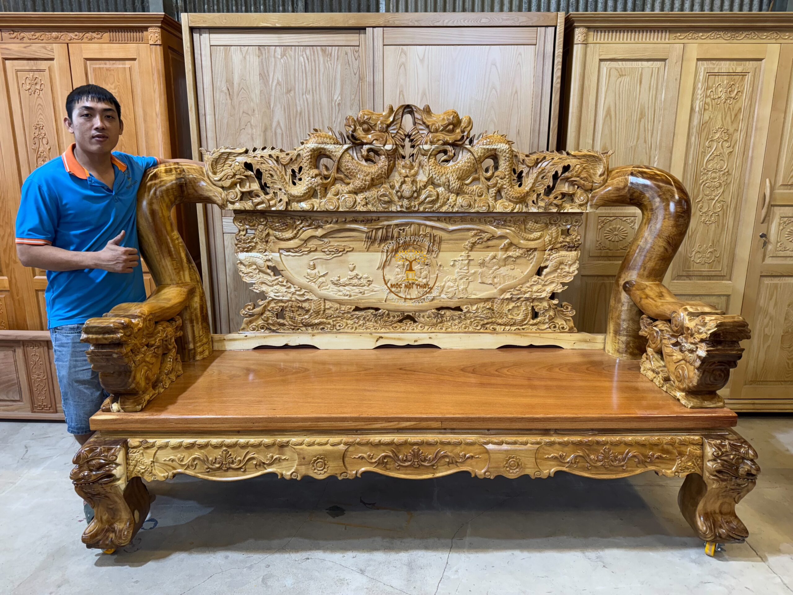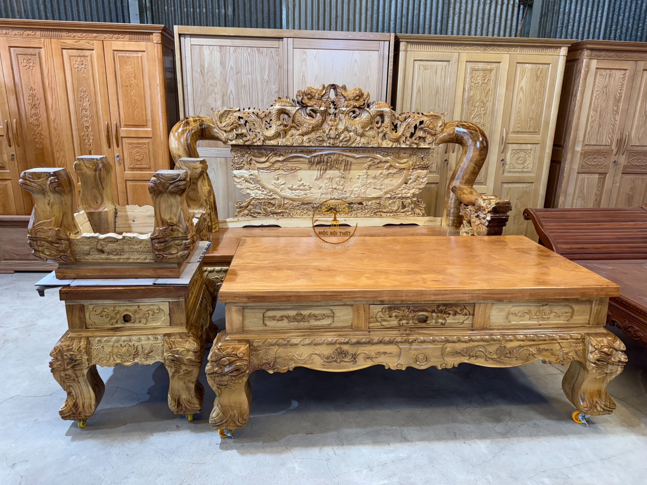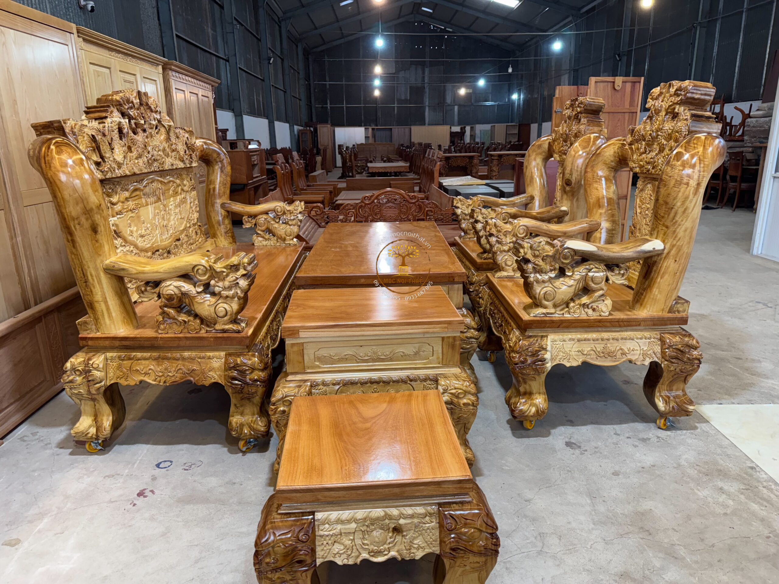 • Bộ bàn ghế phòng khách được làm bằng gỗ tràm rừng lõi có tuổi thọ từ 20 năm trở lên, mặt bàn- mặt ghế được làm bằng gỗ gõ đỏ dày 2,5cm nguyên tấm (kẹp giả dầy 5cm). Bộ bàn ghế làm tay trụ 18cm dưới tay cũng trạm kì lân nguyên con dày 16cm. Tựa ghế ghép 2 tấm dày 4cm cưa đi được trạm Bát Tiên Quá Hải , Bát tiên được xem là biểu tượng phổ biến về trường thọ và may mắn.Sự hiện hữu biểu tượng của họ trong nhà được tin rằng sẽ mang đến sức khỏe, may mắn và hạnh phúc cho các gia chủ.