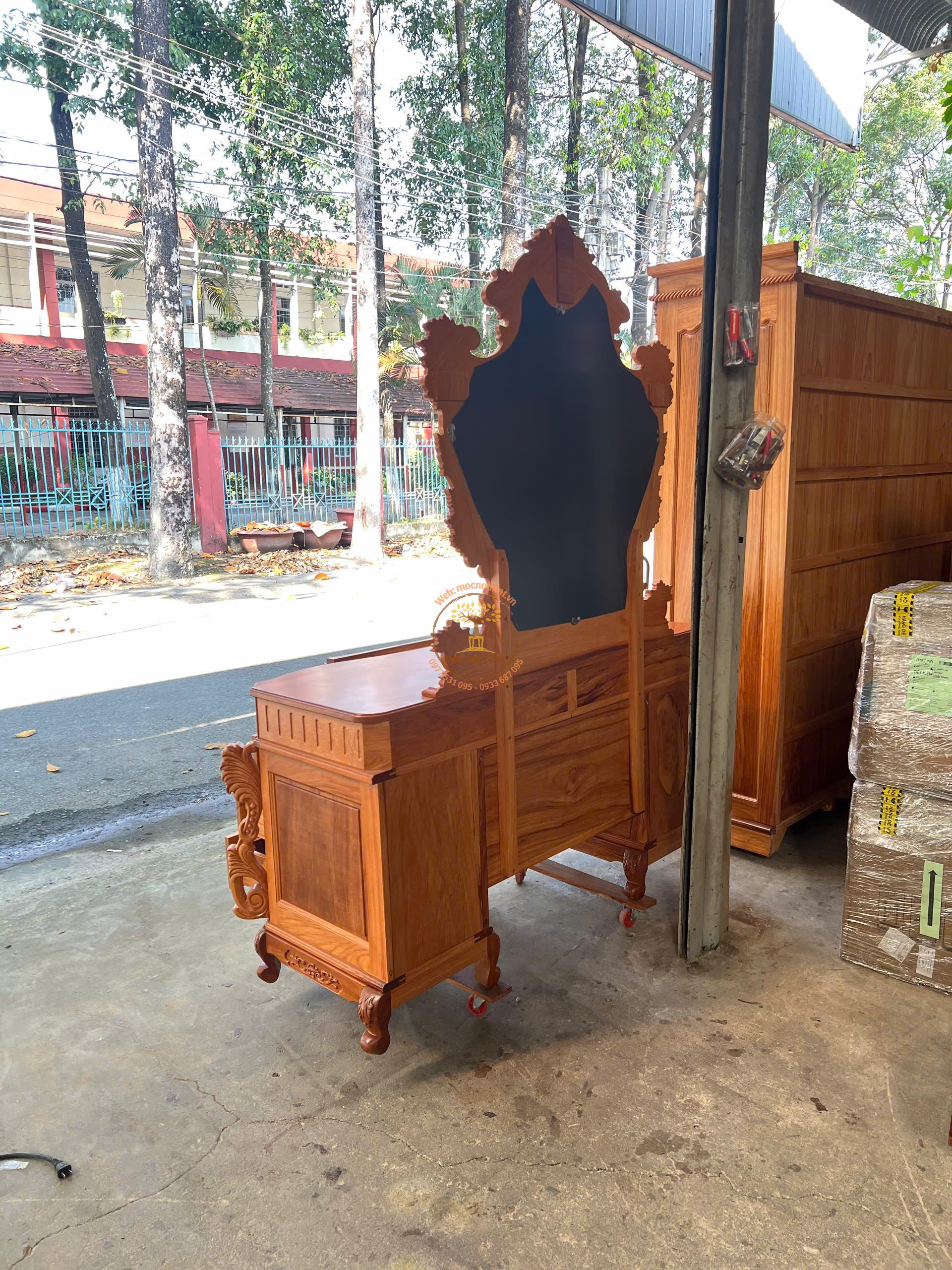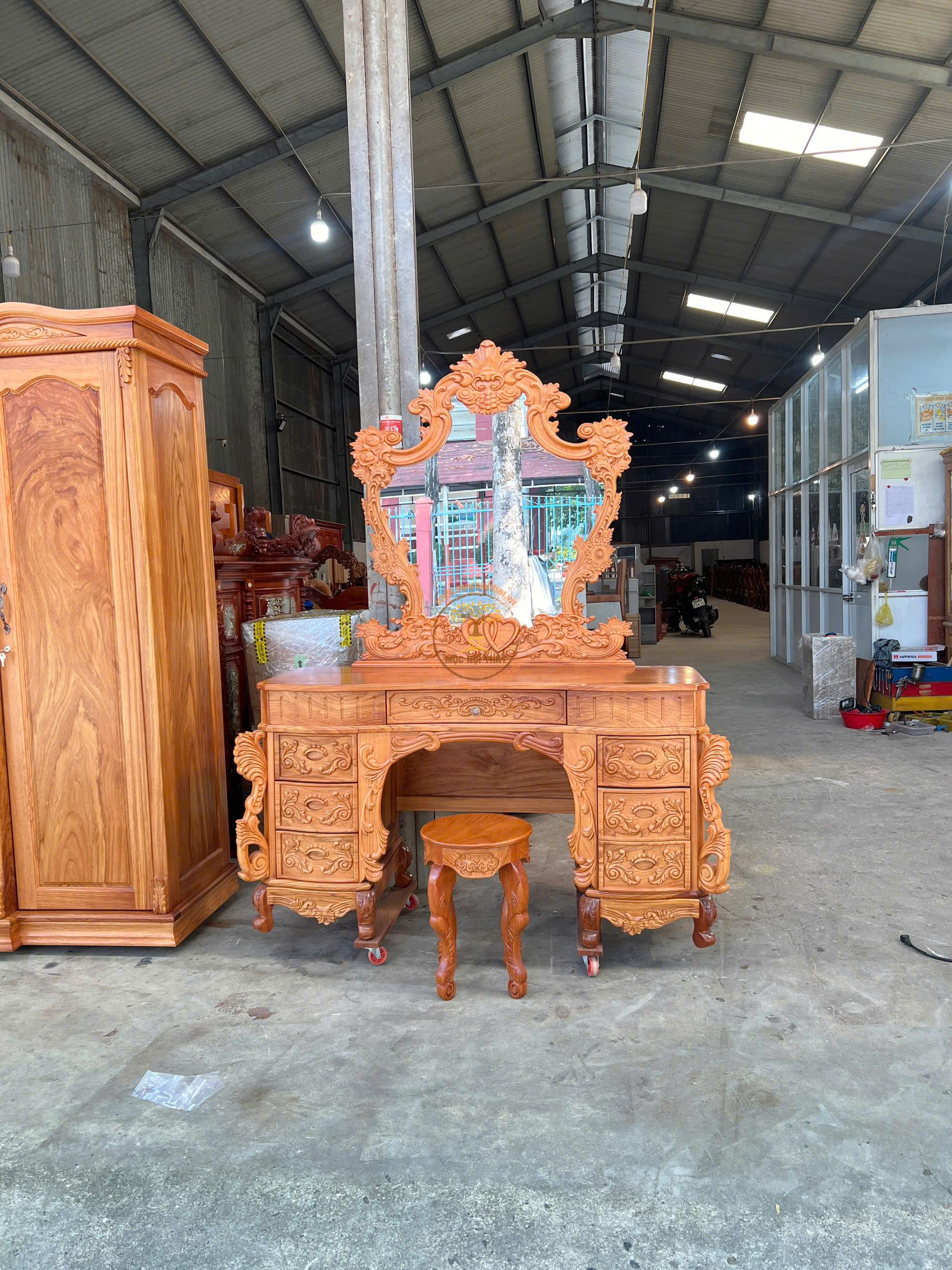 • Mô tả: Bàn trang điểm được làm hoàn toàn bằng gỗ Gõ Đỏ, thiết kế kiểu hoàng gia Robin sang trọng.