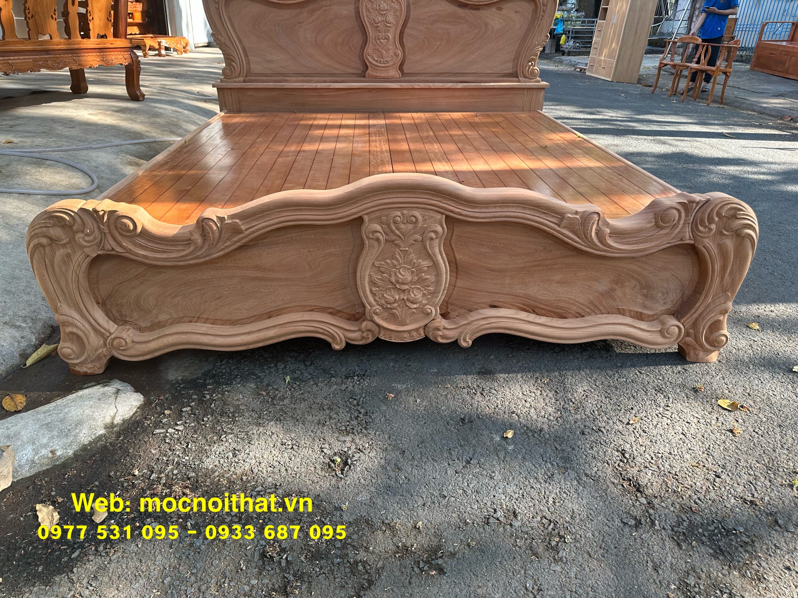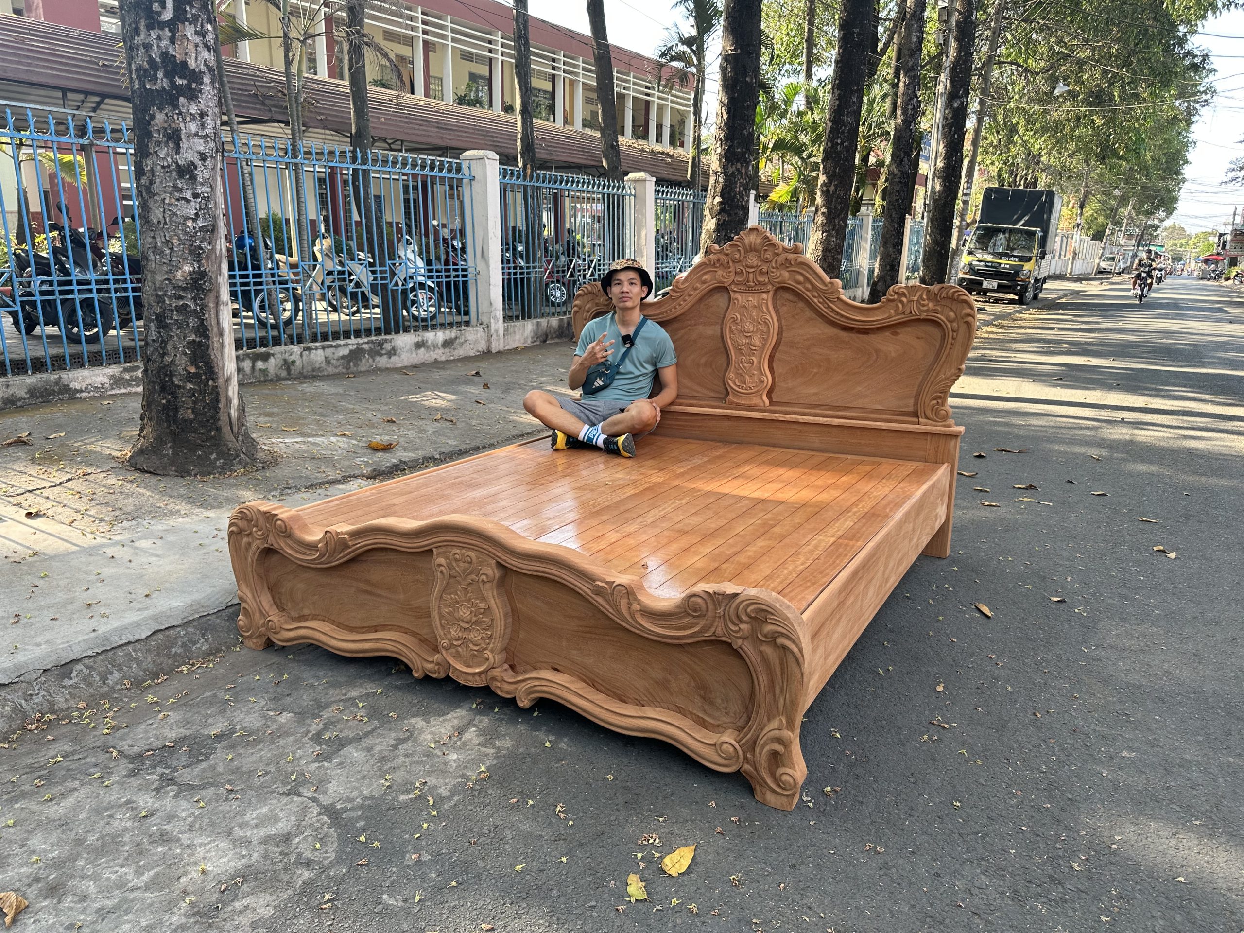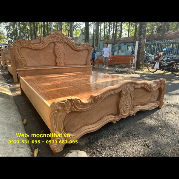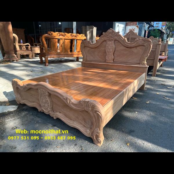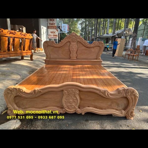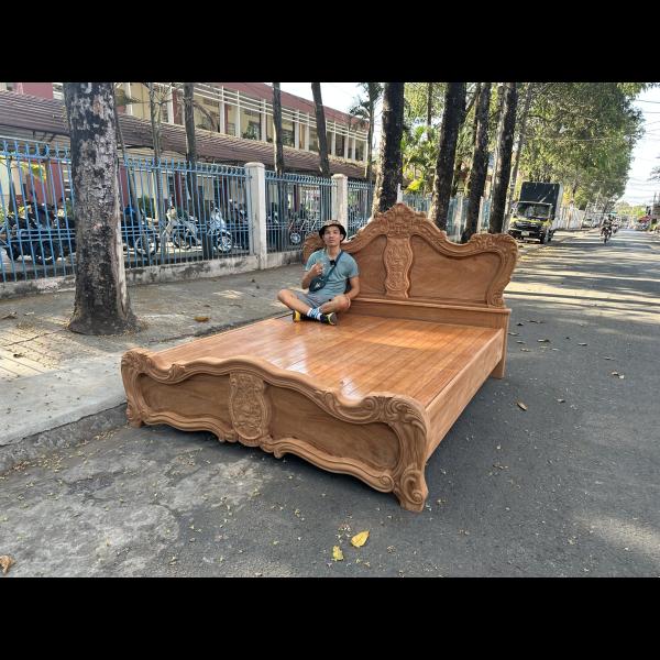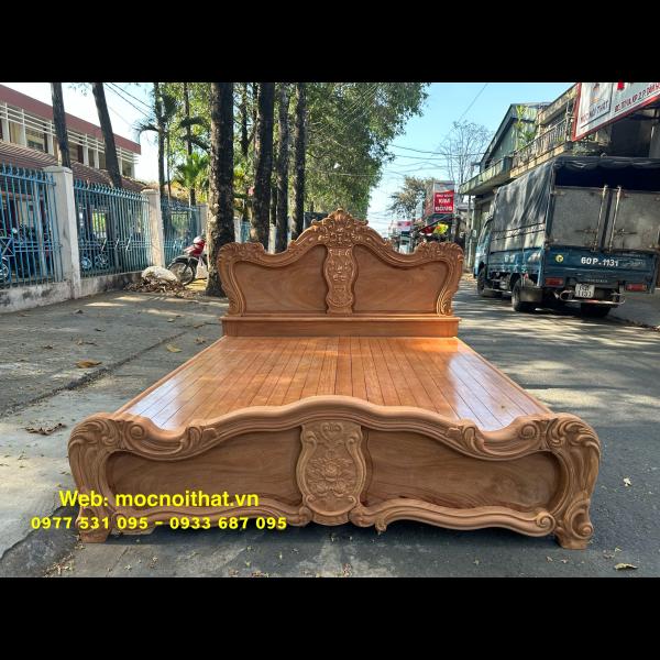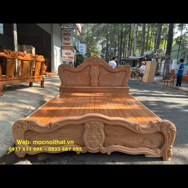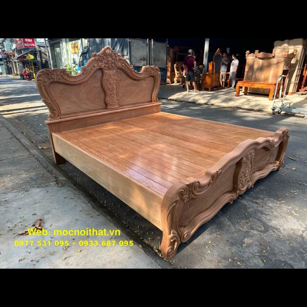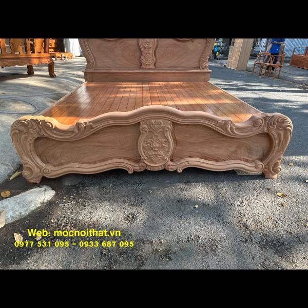 • Giường ngủ được làm bằng gỗ Gõ Đỏ Nam Phi toàn bộ, thang dạt kiểu phản làm bằng gỗ Xoan. Đầu đuôi được thiết kế kiểu hoàng gia, viền đầu giường nguyên khối dày 5cm, ô trám dày 2.5cm chạm đi, đục hoa hồng cnc nổi dáng hoàng gia. Vai rộng 25cm- dày 2.8cm. Trụ chân 10cm, dày 6.8cm. Đỉnh giường làm hoa văn lá tây đẹp mắt.