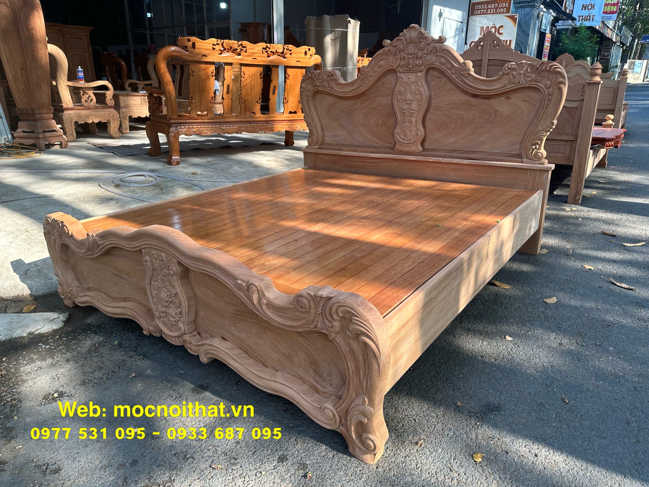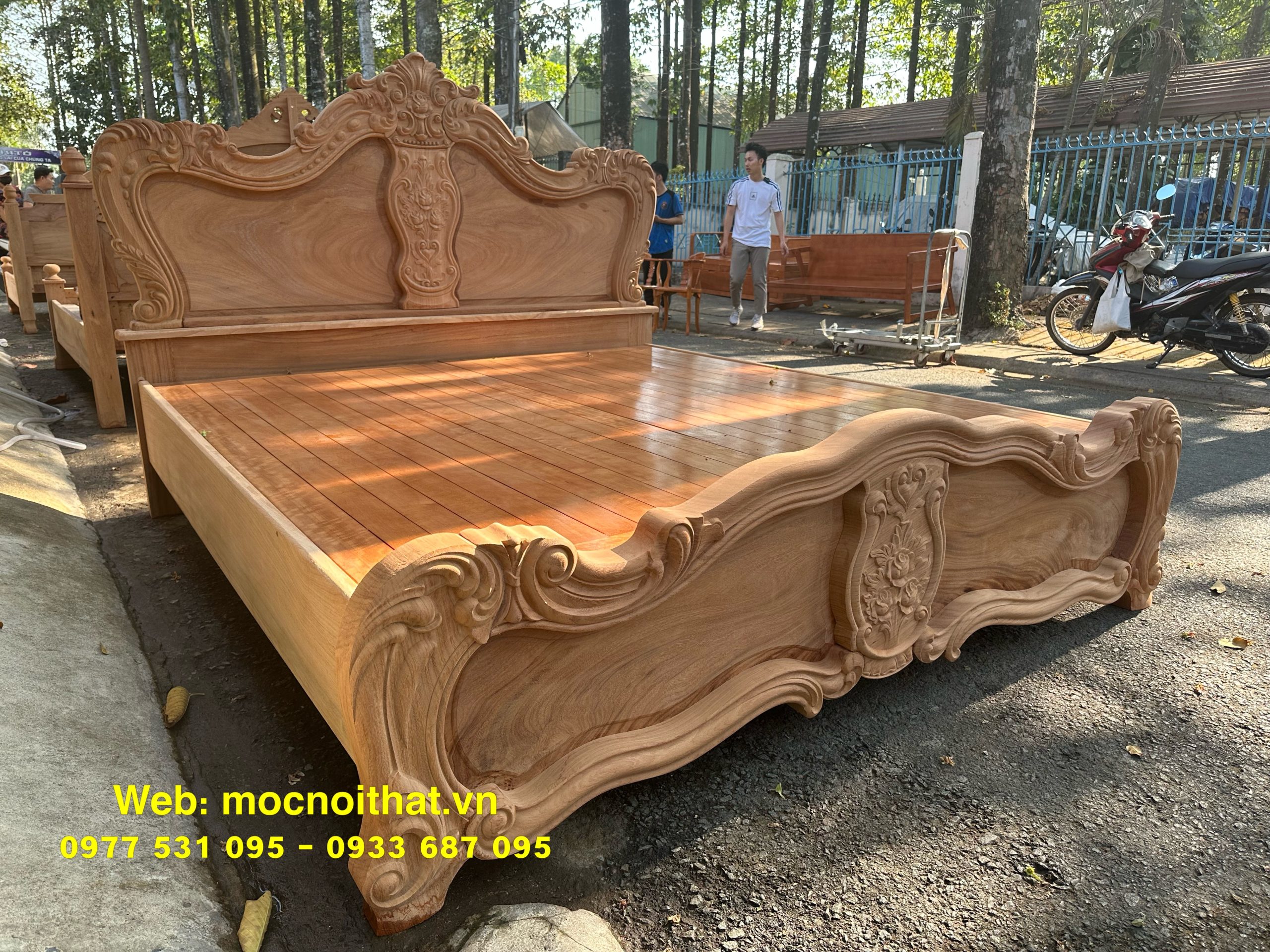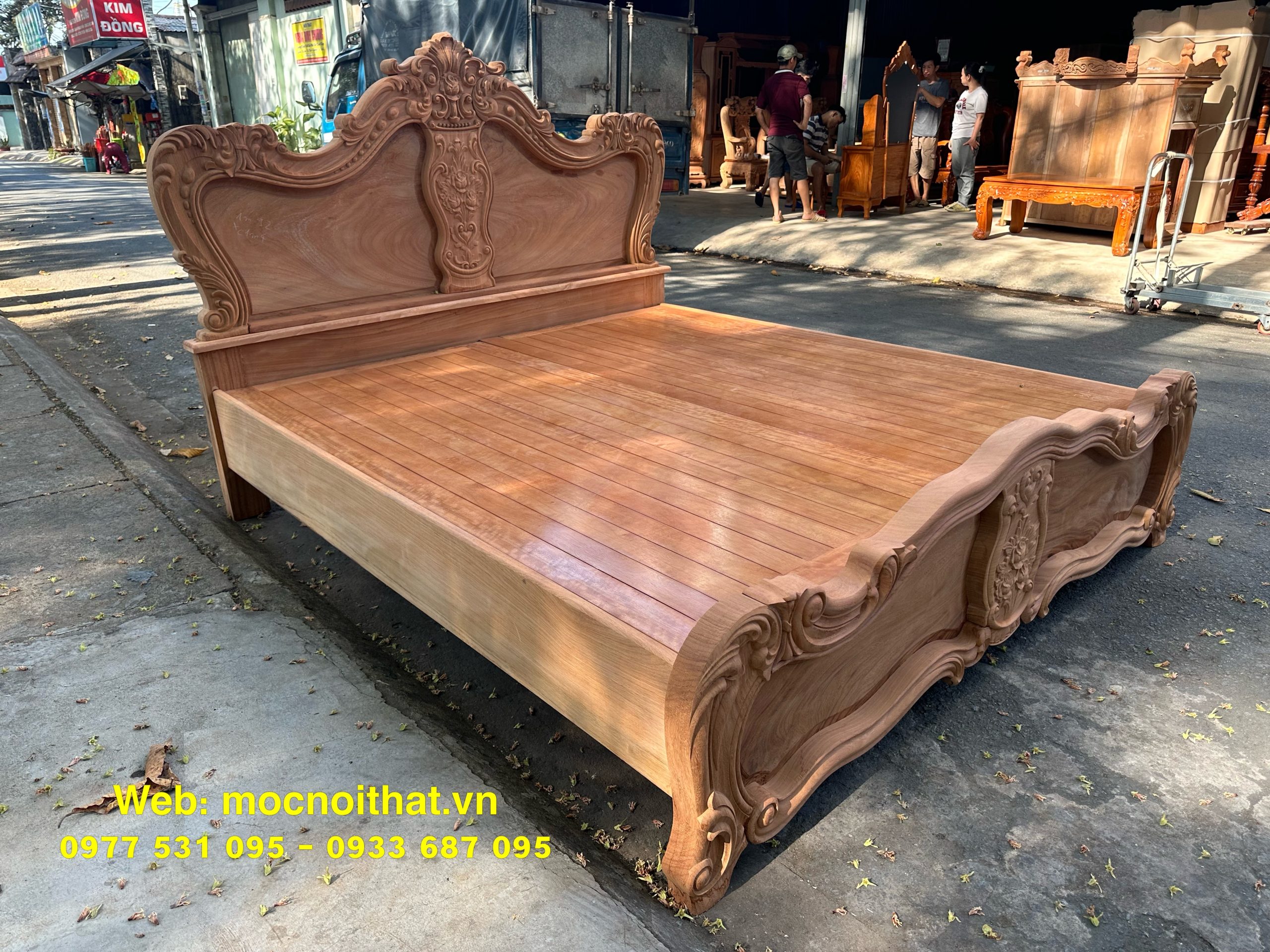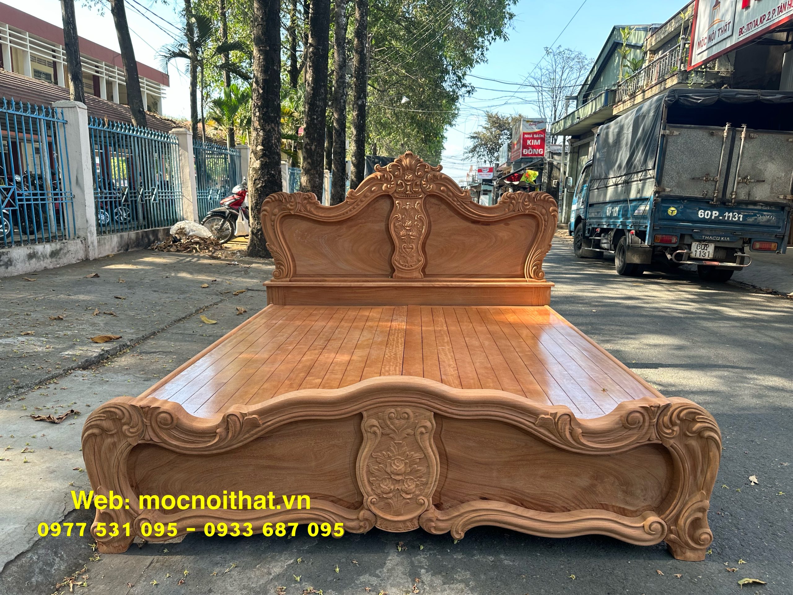 • Giường ngủ được làm bằng gỗ Gõ Đỏ Nam Phi toàn bộ, thang dạt kiểu phản làm bằng gỗ Xoan. Đầu đuôi được thiết kế kiểu hoàng gia, viền đầu giường nguyên khối dày 5cm, ô trám dày 2.5cm chạm đi, đục hoa hồng cnc nổi dáng hoàng gia. Vai rộng 25cm- dày 2.8cm. Trụ chân 10cm, dày 6.8cm. Đỉnh giường làm hoa văn lá tây đẹp mắt.