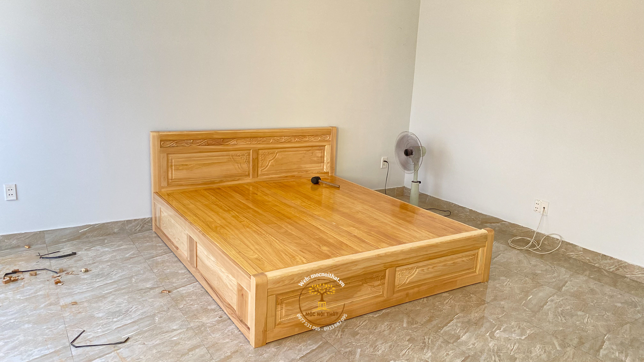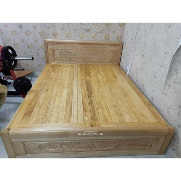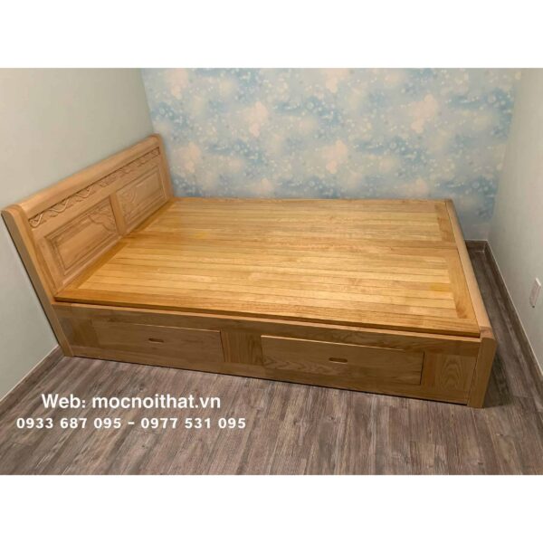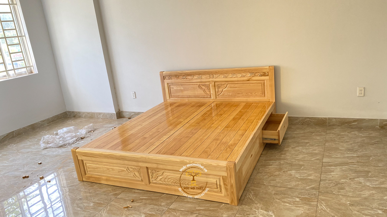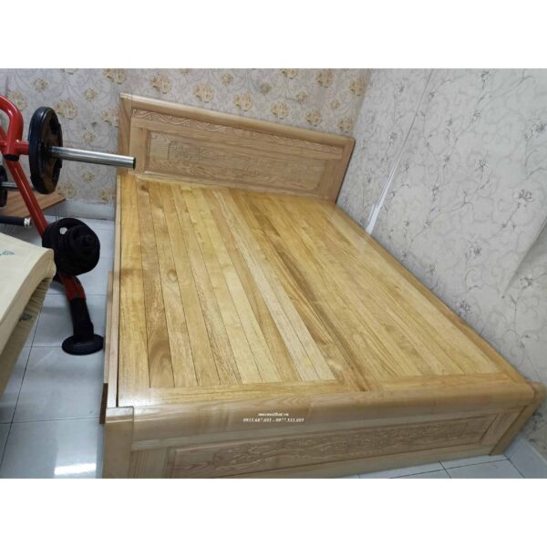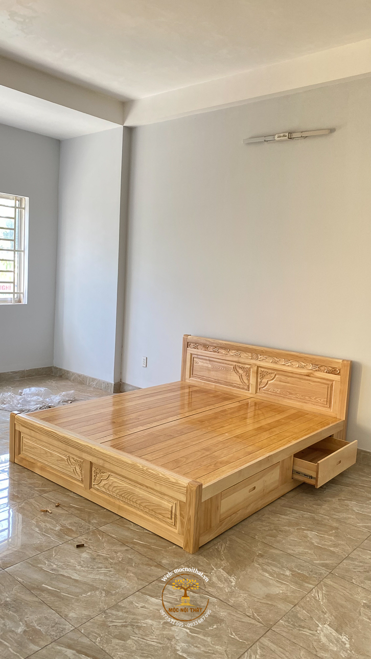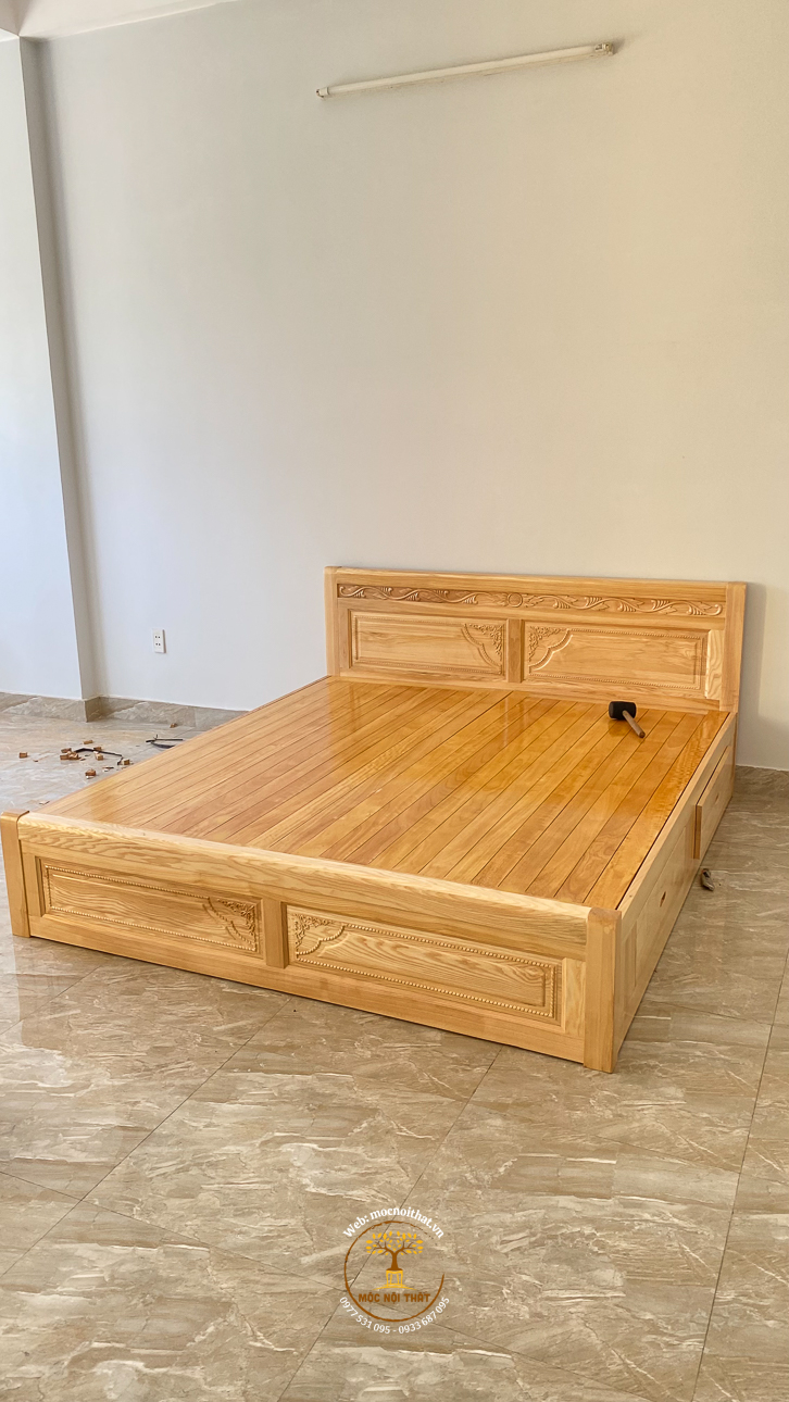 Giường ngủ được làm hoàn toàn bằng gỗ sồi Pháp, thiết kế dạt phản để tạo cảm giác thoải mái và phù hợp cho các khách hàng lớn tuổi. Ngoài ra giường còn có 2 hộc kéo bên hông để tạo thêm không gian để đồ đạc.