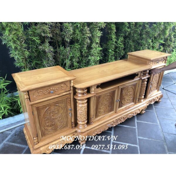 • Mô tả: Kệ tivi làm bằng gỗ Gõ Đỏ Nam Phi toàn bộ, Mặt cửa được chạm khắc Tứ Quý: Tùng, Cúc, Trúc Mai tinh xảo. Thiết kế theo phong cách cổ xưa.