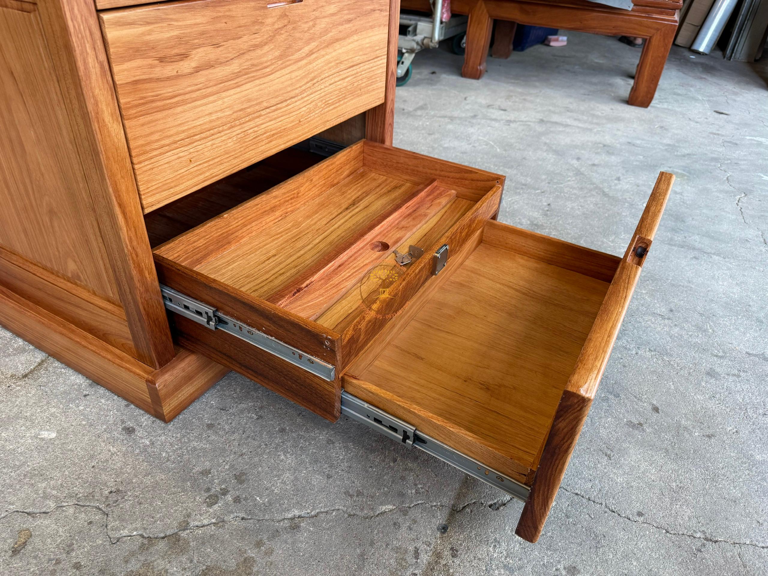 • Mô tả:  Tủ đầu giường được làm bằng gỗ Gõ Đỏ hoàn toàn, thiết kế có 2 ngăn kéo, đặc biệt có 4 ngăn hộc ẩn ( 1 ẩn khóa từ đình tủ, 1 ẩn rút chốt hậu tủ, 1 ẩn nam châm hộc kéo, 1 ẩn kéo khóa hộc kéo)